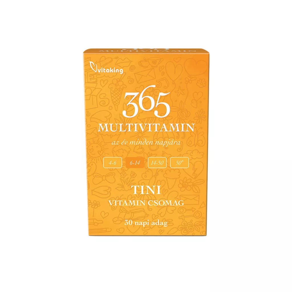 Minőségét megőrzi: 2026-06-14 A Multi Profi Tini vitamincsomag mostantól 365 Multivitamin Tini néven érhető el, új külsővel és megújult összetétellel.A tinédzserkor a növekedés, a fejlődés és a folyamatos kihívások időszaka. A 365 Multivitamin Tini csomag összetevői segítenek gondoskodni arról, hogy a fiatalok minden szükséges vitamint, ásványi anyagot és egyéb tápanyagot megkapjanak ahhoz, hogy a legjobb formájukat hozzák az év 365 napján.A modern életvitel, az iskolai terhelés, a sport és a szociális élet mind komoly energiát igényel a fejlődő szervezettől. Éppen ezért ebben a multivitamin csomagban kiemelten fontos tápanyagokat válogattunk össze, amelyek hozzájárulnak a normál energiatermelő anyagcsere folyamatokhoz, az idegrendszer megfelelő működéséhez, valamint a csontok és az izmok egészségéhez.Vitaminok és ásványi anyagok könnyen fogyasztható kis tablettákban.Finom, eper ízű D3 vitamin 2000NE (hozzáadott cukor nélkül, sztíviával édesítve).Kis méretű Omega-3 gélkapszula, magas EPA és DHA tartalommal.Tőzegáfonya koncentrátum 504mg.Hatóanyag/1 csomag:A-vitamin 5000NE - 1500 μgRE; B1-vitaminm4,5 mg; B2- vitamin 5,1 mg; Niacin (Nikotinamid) 20 mg; Pantoténsav 10 mg; B6-vitamin 6 mg; Biotin 45 μg; Folsav 400 μg; B12-vitamin 18 μg; C-vitamin 370 mg; D3-vitamin 3000NE - 75 μg; E-vitamin 45NE - 30,12 mgTE; K1-vitamin 30 μg; Cink 7,5 mg; Jód 150 μg; Kalcium 126 mg; Króm (Króm(III)- pikolinát) 20 μg; Magnézium (110,46 mg magnézium-oxidból) 63 mg; Mangán 2 mg; Molibdén 20 μg; Réz 0,99 mg; Szelén 15 μg; Vas 9 mg; Citrus bioflavonoid 50 mg; Inozitol 50 μg; Kolin 50 μg; Halolaj koncentrátum, amelyből 500 mg, DHA 150 mg, EPA 100 mg; Tőzegáfonya (gyümölcs) 25:1 kivonat (Vaccinium macrocarpon) (megfelel 4200 mg friss tőzegáfonyának) 168 mgÖsszetevők: Étrend-kiegészítő vitaminokkal és ásványi anyagokkal fiataloknak: emulgeálószerek (mikrokristályos cellulóz, térhálós nátrium-karboxi-metil-cellulóz, trikalcium-foszfát, nátrium-karboxi-metil-cellulóz), dikalcium-foszfát, L-aszkorbinsav, magnézium-oxid, D-alfa-tokoferilacetát, stabilizátor: hidroxi-propil-metil-cellulóz, citrus bioflavonoid, vas(II)-fumarát, tömegnövelő szerek (maltodextrin, kukoricakeményítő), csomósodást gátló anyagok (szilícium-dioxid, zsírsavak magnéziumsói), retinil-acetát, nikotinamid, kalcium-D-pantotenát, kolekalciferol, cink-oxid, fényező anyag: polivinil-alkohol, piridoxinhidroklorid, tiamin-mononitrát, mangán-szulfáriboflavin, nátrium-molibdát, nátrium-szelenit, réz(II)-oxid, fillokinon, folsav, káliumjodid, antioxidáns: borkősav, króm(III)-pikolinát, kolinbitartarát, D-biotin, inozitol, cianokobalamin Étrend-kiegészítő 500 mg halolaj omega-3 zsírsavval: halolaj, zselatin kapszulahéj, nedvesítőszer: glicerin, tisztított víz, természetes citrom olaj, antioxidáns: DL-alfa-tokoferil-acetát Étrend-kiegészítő Tőzegáfonya: tőzegáfonya (Vaccinium Macrocarpon) (gyümölcs) 25:1 kivonat, hordozó: mikrokristályos cellulóz, pullulán kapszulahéj, L-aszkorbinsav, emulgeálószerek (MCT olaj, zsírsavak) Étrend-kiegészítő D3-vitamin 2000NE eper ízű szopogató tabletta: tömegnövelő szerek (izomalt, szárított eperlé), kolekalciferol, csomósodást gátló anyag: zsírsavak, savanyúságot szabályozó anyag: almasav, színezék: szárított céklalé por, természetes eper aroma, édesítőszer: szteviol-glikozidAdagolás: napi 1 csomagFigyelmeztetés: A doboz gyermekek elől gondosan elzárva, száraz hűvös helyen sugárzó hőtől és fénytől védve tartandó!Egyéb allergén információ: Nem került felhasználásra