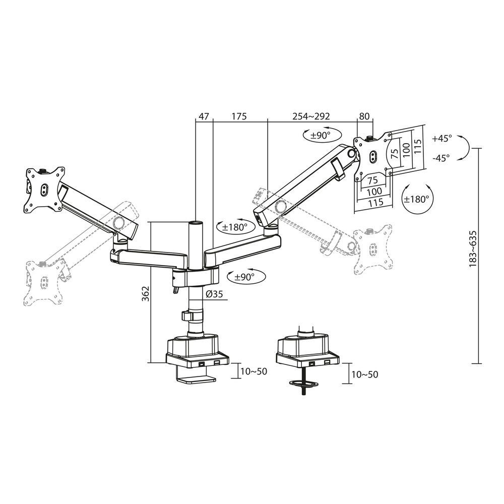 - Monitortartó 2 monitorhoz 35" és 12 kg-ig; könnyű magasságállítás a rúdra szerelt mechanikus rugóval
