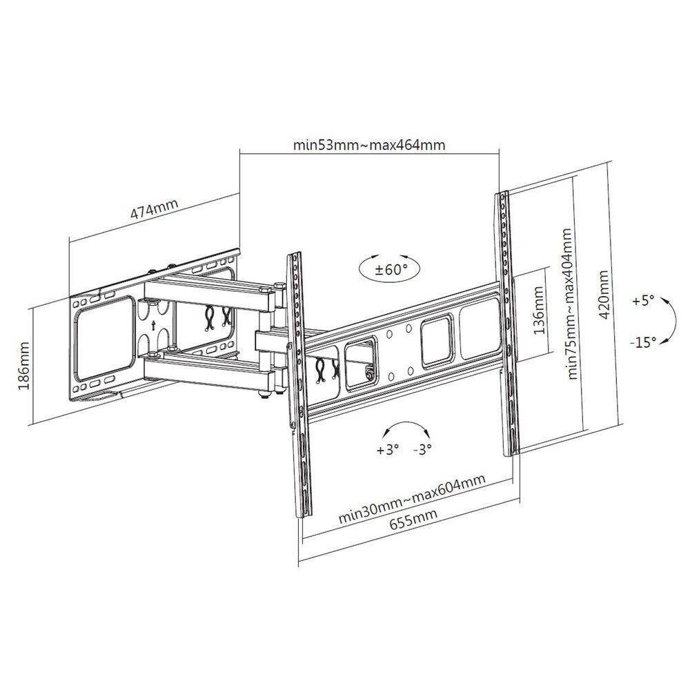 Az AC8355 Full Motion TV fali tartó ideális megoldás televíziójának (37 hüvelyk és 70 hüvelyk között, max. 40 kg súly) falra szereléséhez. A tartó alkalmas minden VESA 75x75,100x100, 200x100, 200x200, 200x200, 300x300, 400x200, 400x400 és 600x400 méretű TV készülékhez. A TV felfelé/lefelé -15°/+5°-os szögben dönthető, és -60°/+60°-os szögben balra/jobbra forgatható. Az AC8355 fali tartó 3 forgatási ponttal rendelkezik, maximálisan 47 cm-es kihúzással. Fordítsa a TV-t bármelyik irányba a legjobb betekintési szög elérése érdekében. Emellett az AC8355 rendelkezik -3°/+3°-os szintbeállítással is. A kábelek a kényelmes kábelkezelő rendszernek köszönhetően nem kerülnek szem elé. Egy buborékos vízmértéket is tartalmaz.