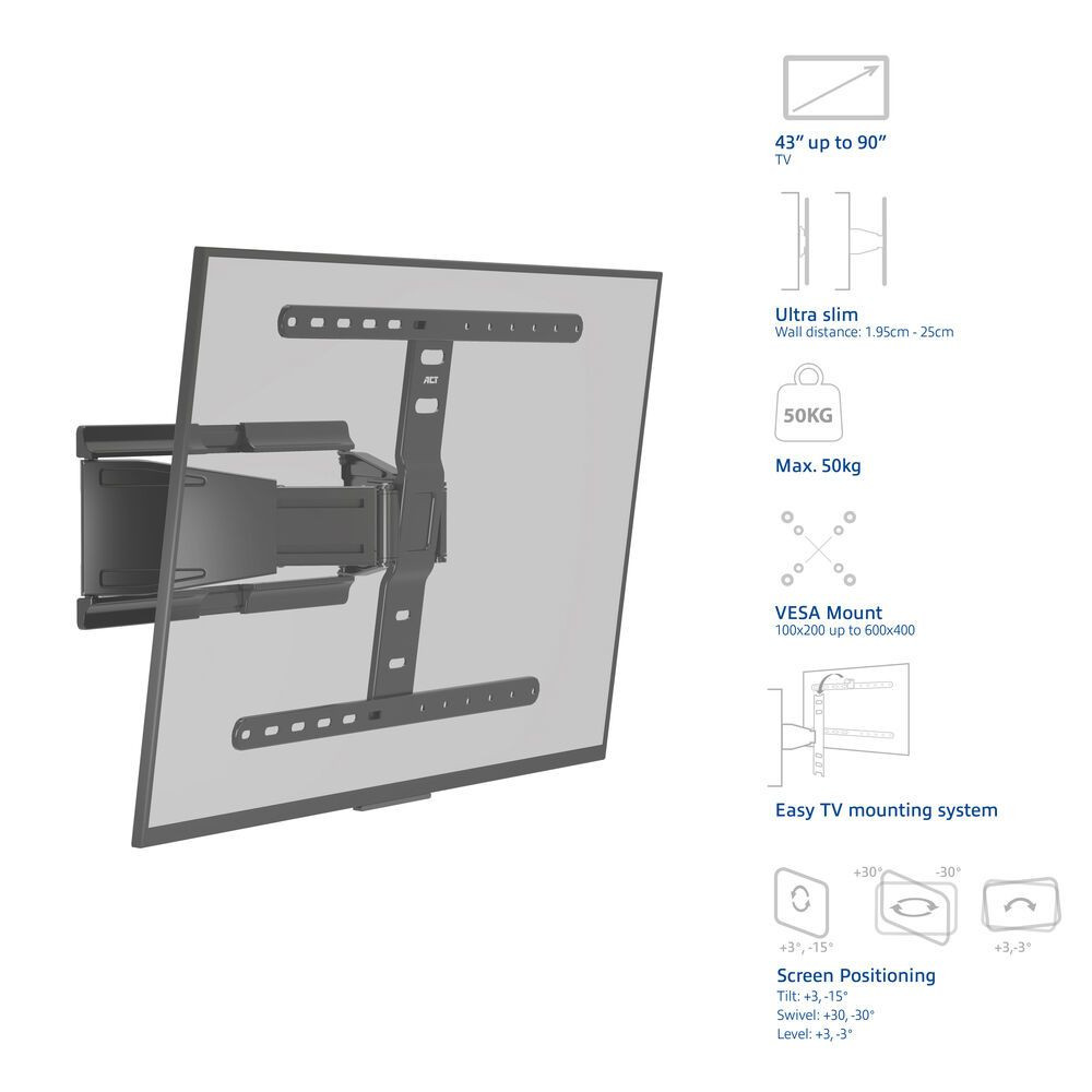 Az AC8357 teljes mozgású TV-fali tartó 90 hüvelykes és 50 kg-os TV-khez lett tervezve. Ez az ultravékony fali tartó ötvözi a dizájnt és a rugalmasságot, lehetové téve, hogy a TV-t mindössze 1,95 cm-re helyezze el a faltól, vagy kihúzza a konzolt, így a TV 25 cm-re kerül a faltól. Állítsa be a kívánt nézopozíciót a TV döntésével vagy elforgatásával. Az AC8357 minden szükséges alkatrészt tartalmaz az egyszeru telepítéshez: fúrósablont, vízmértéket és rögzítoelemeket.