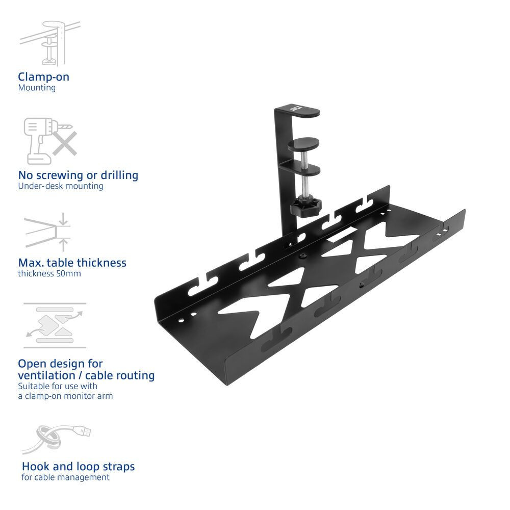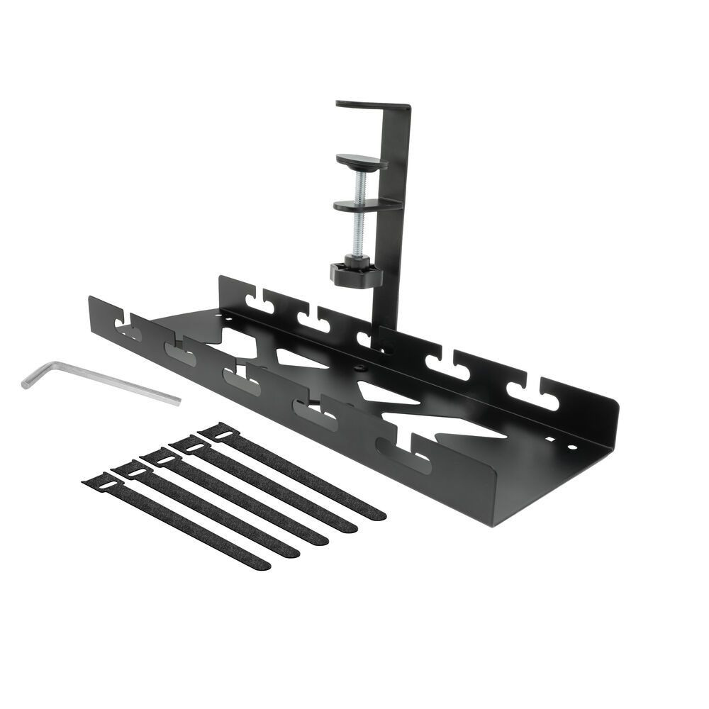 Az AC8378 fém kábelrendezo tálca rendben és tisztán tartja az asztalát, és rendszerezi a kábelezést. A tálca szélessége 40 cm, és elegendo tárolókapacitást biztosít a hosszabbító, a laptop tölto, a kábelek és egyéb eszközök tárolásához. A nyitott szerkezet ideális a szellozéshez és a kábelek elvezetéséhez. És a legjobb: szerelés csavarozás és fúrás nélkül. A tálcát a mellékelt szorítóbilinccsel könnyedén rögzítheti az asztal alá (max. vastagság 50 mm). Az AC8378 szorítóbilinccsel ellátott monitor karral is használható.