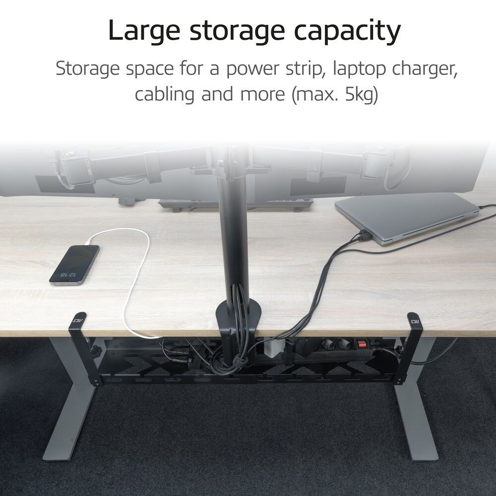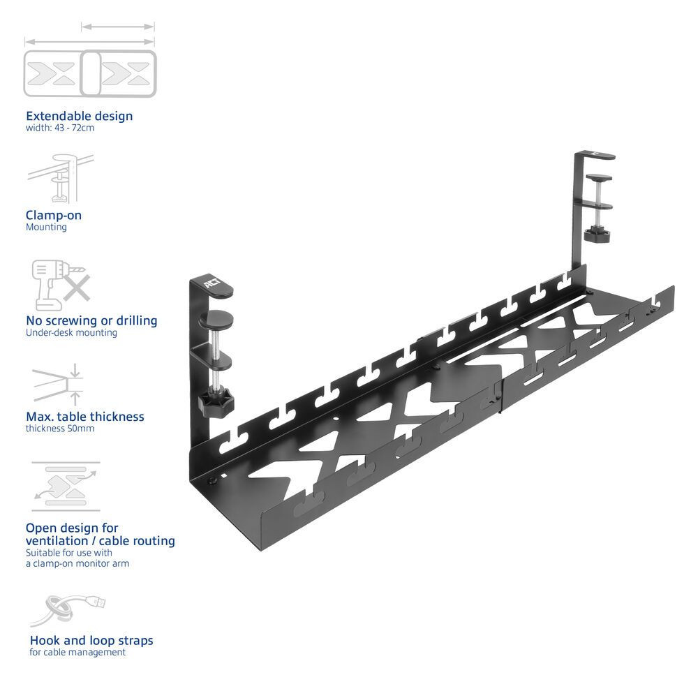 Az AC8379 fém kábelrendezo tálca rendben és tisztán tartja az asztalát, és rendszerezetté teszi a kábelezést. A kábelrendezo tálca könnyen meghosszabbítható és a kívánt szélességhez igazítható: 43 centimétertol 72 centiméterig, így különbözo méretu asztalokhoz is használható. A tálca elegendo tárolókapacitást biztosít a hosszabbító kábel, a laptop tölto, a kábelek és egyéb eszközök tárolásához. A nyitott szerkezet ideális a szellozéshez és a kábelek elvezetéséhez. És a legjobb: szerelés csavarozás és fúrás nélkül. A tálcát a mellékelt rögzítokapcsokkal könnyen rögzítheti az íróasztal alá (max. vastagság 50 mm). Az AC8379 rögzítokapcsos monitor karral is használható.