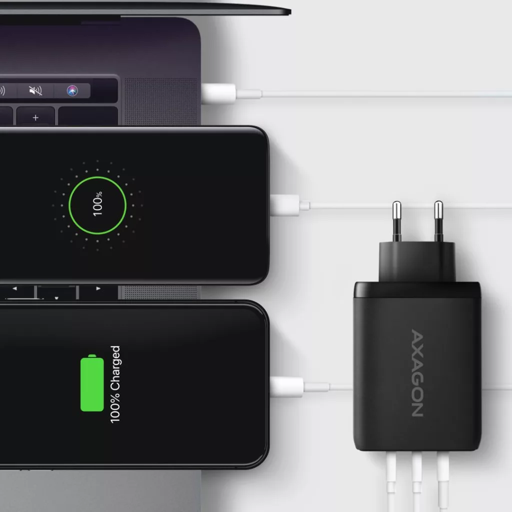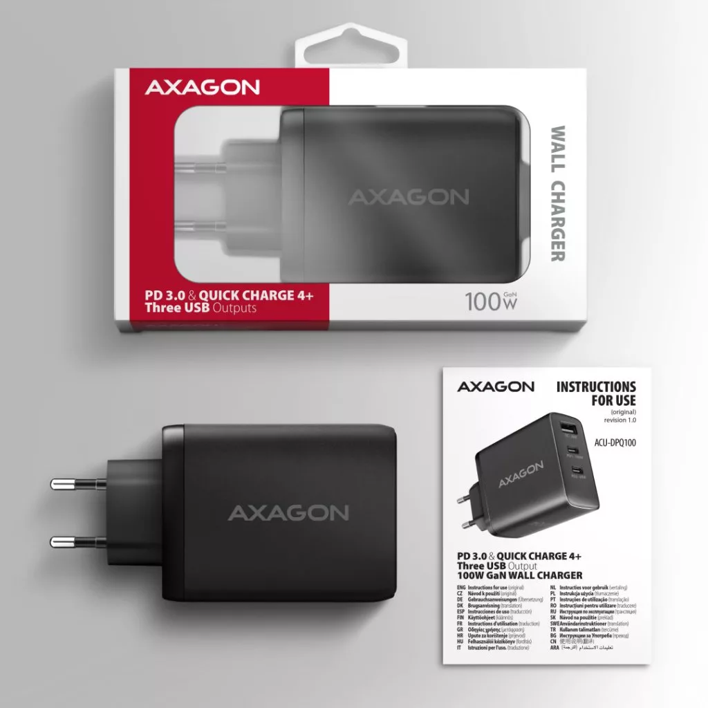 Utazó fali töltő AXAGON ACU-DPQ100 GaN egyszerre akár három mobileszköz gyors töltéséhez. A 100W összteljesítménnyel a töltő a lehető legnagyobb sebességgel tölti a notebookokat, telefonokat és más mobileszközöket. Az adapter egy szabványos USB-A csatlakozóval, de két kétoldalas USB-C csatlakozóval is rendelkezik.