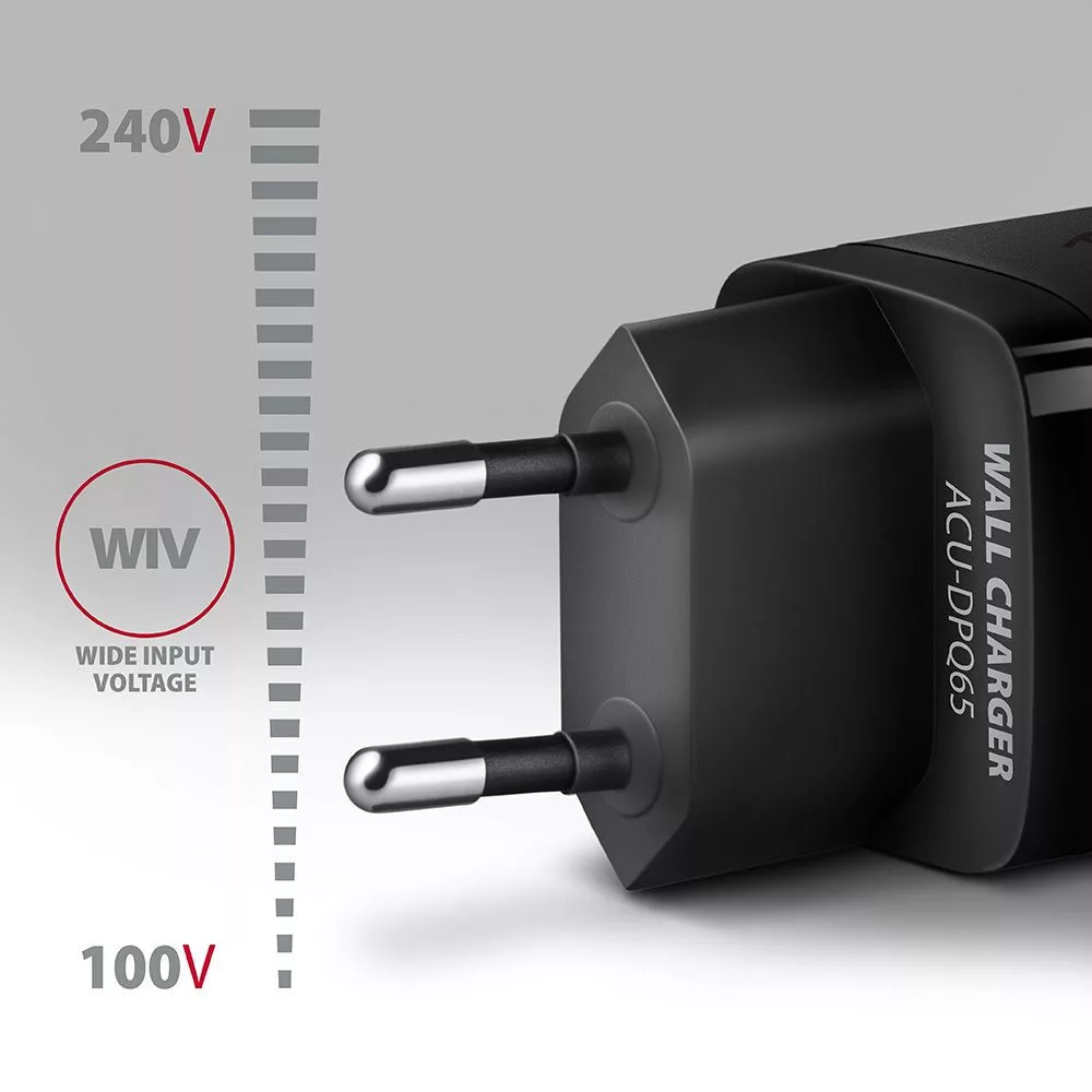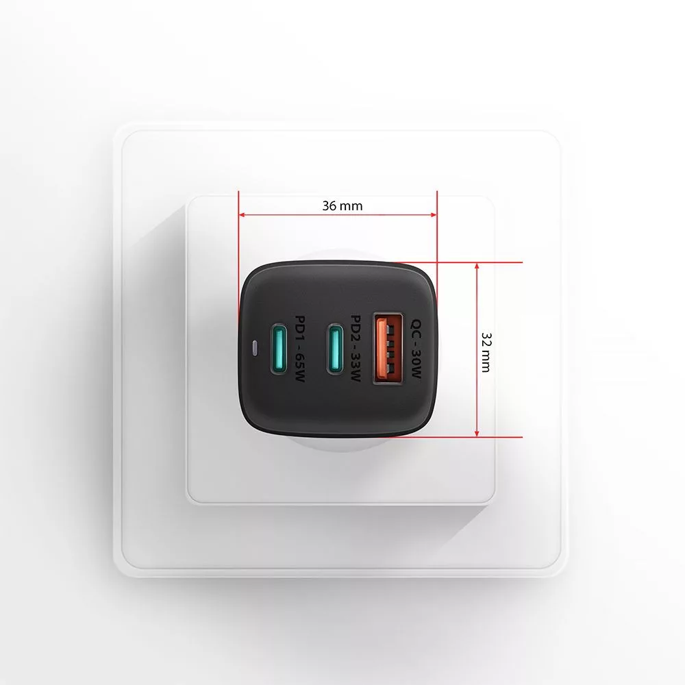 Kompakt utazó fali töltő AXAGON ACU-DPQ65 GaN egyszerre akár három mobileszköz gyors töltéséhez.