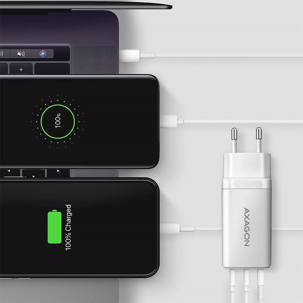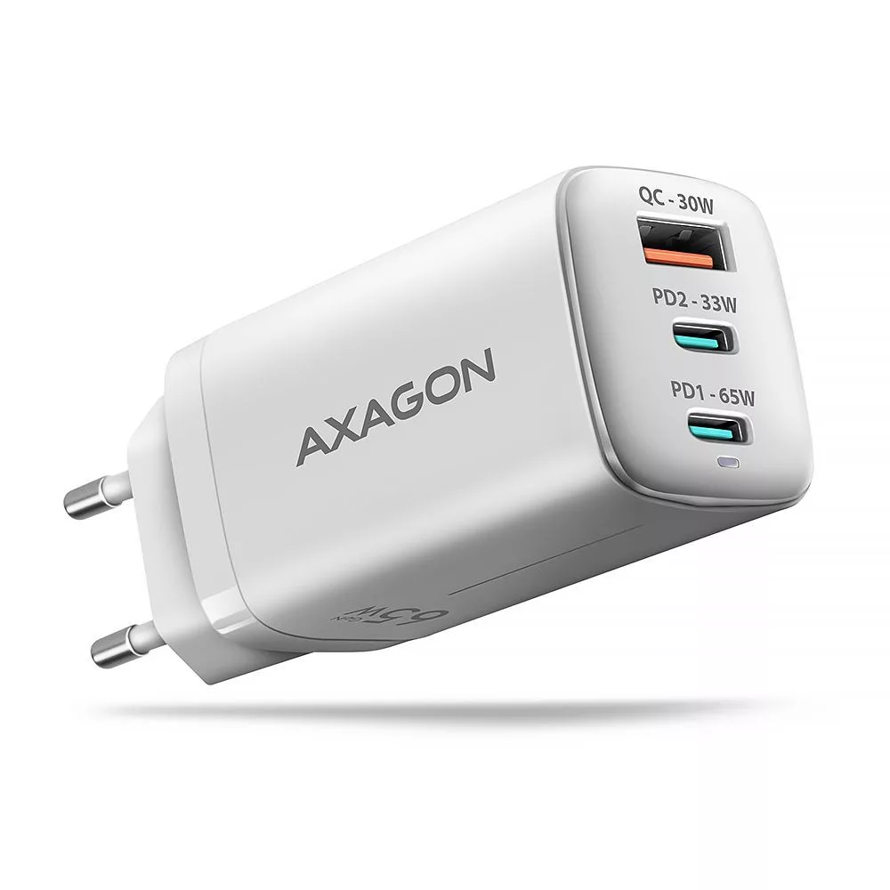 Kompakt utazó fali töltő AXAGON ACU-DPQ65W GaN egyszerre akár három mobileszköz gyors töltéséhez.