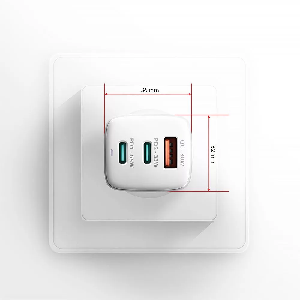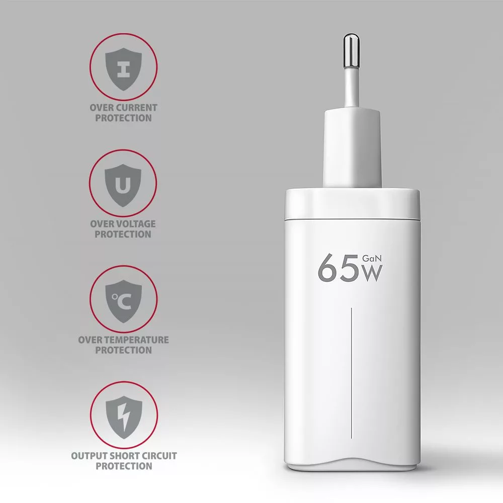 A 65W összteljesítménnyel a töltő a lehető legnagyobb sebességgel tölti a notebookokat, telefonokat és más mobileszközöket. Az adapter egy szabványos USB-A csatlakozóval, de két kétoldalas USB-C csatlakozóval is rendelkezik.