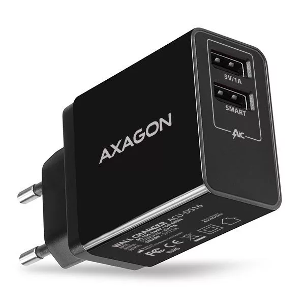 AXAGON ACU-DS16 hálózati duális USB töltő egyidejűleg akár két hordozható eszköz töltésére.