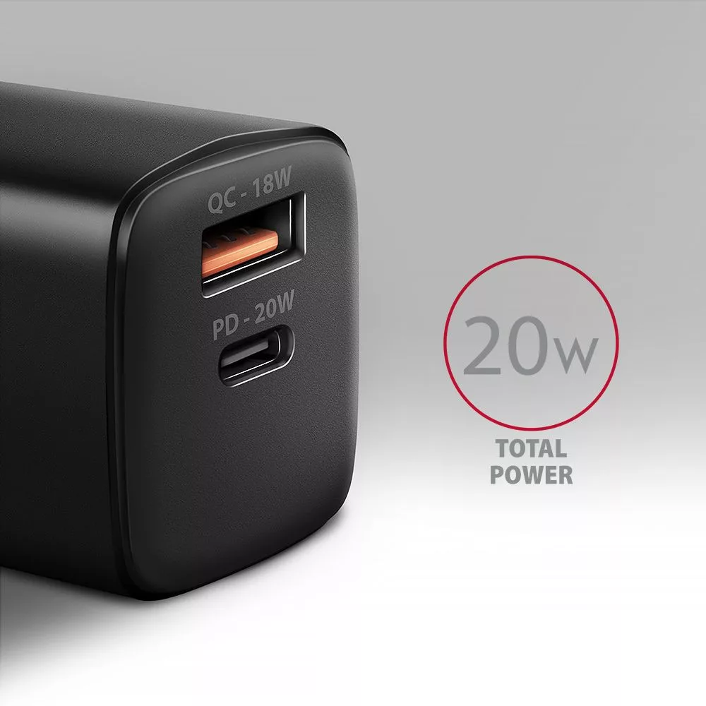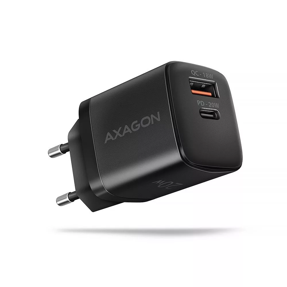 A kompakt AXAGON ACU-PQ20 hálózati töltő akár két mobileszköz egyidejű gyors töltését teszi lehetővé. A 20W összteljesítménnyel a töltő a lehető legnagyobb sebességgel tölti a telefonokat, táblagépeket és más mobileszközöket. Az adapter egy szabványos USB-A csatlakozóval, de kétoldalas USB-C csatlakozóval is rendelkezik.