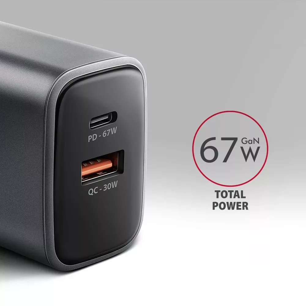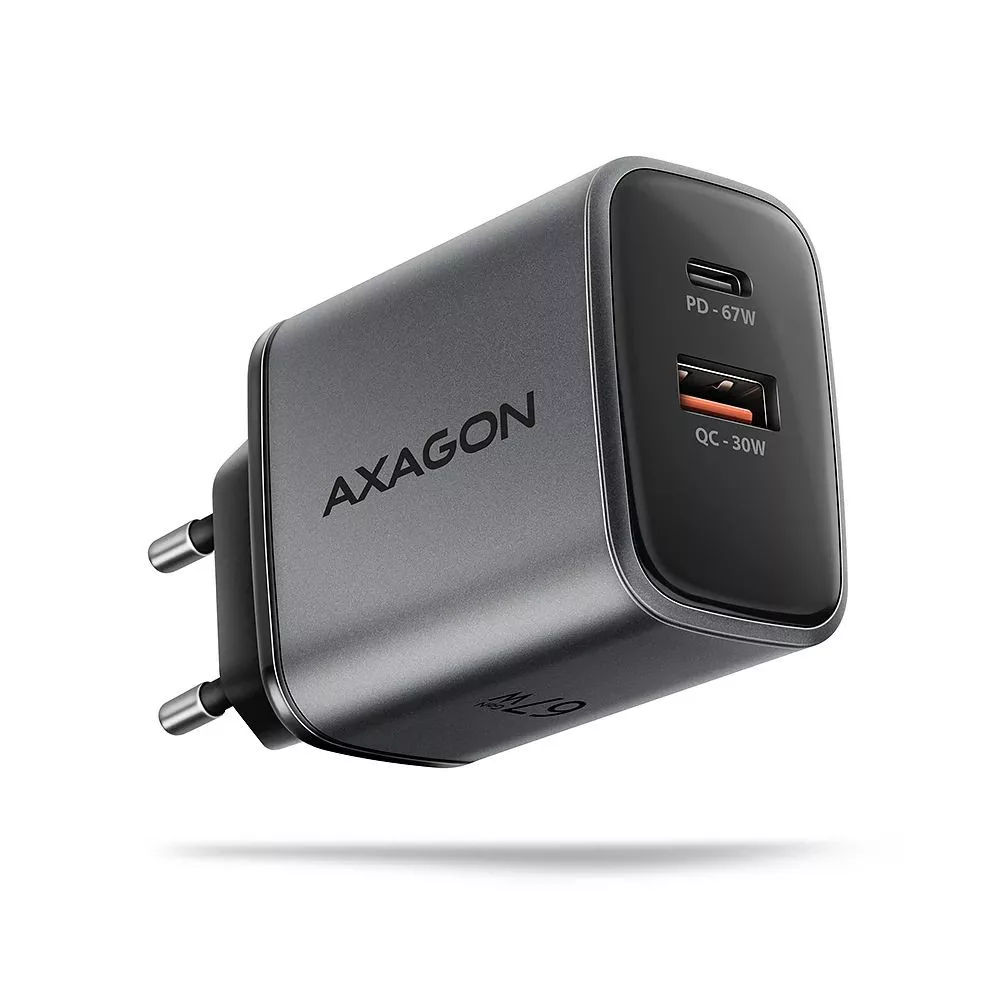 Travel wall charger AXAGON ACU-PQ67 GaN enables fast charging of up to two mobile devices simultaneously. Thanks to the total 67W output power, the charger can recharge laptops, tablets, phones and other mobile devices at the highest possible speed. The adapter offers not only a standard USB-A connector, but also a reversible USB-C connector.