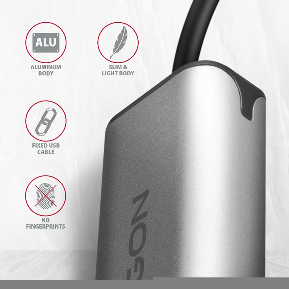 A fém adapterfedél alumíniumból készül, tökéletes mechanikai védelmet és kiváló hőelvezetést biztosít. Kompakt méreteinek és minimális súlyának köszönhetően ideális kiegészítő a laptopokhoz. A Windows, macOS és Linux operációs rendszerek jelenlegi verzióinak támogatása lehetővé teszi bármely asztali számítógép, laptop vagy ultrabook amely modern, kétoldalas USB Type C csatlakozóval rendelkezik.