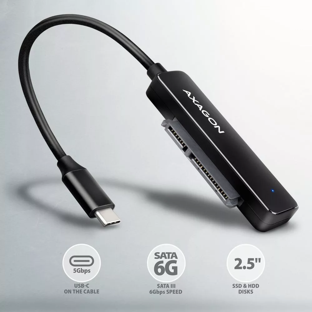 Egy kompakt AXAGON ADSA-FP2C SLIM adapter USB-C 5Gbps és SATA 6G interfésszel egy SSD vagy 2.5" SATA merevlemezekhez vagy SSD-hez. A számítógéphez való csatlakozást egy 20 cm hosszú, állandóan csatlakoztatott USB-C kábel teszi lehetővé. Az USB 3.2 Gen 1 interfésznek köszönhetően az átviteli sebesség akár 5 Gb/s, a Plug & Play funkció biztosítja az automatikus csatlakozást a számítógéphez.
