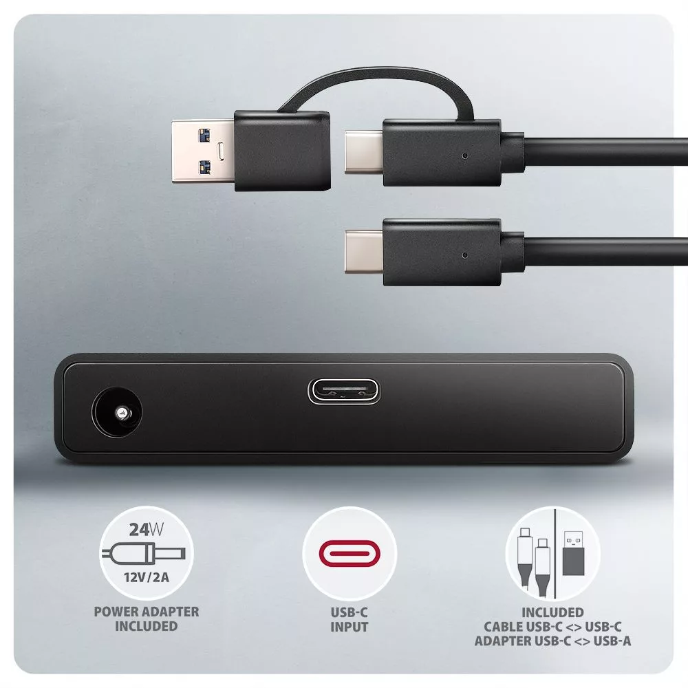 A csomagban talál egy USB-C <-> USB-C 60 cm kábelt egy fix USB-C -> USB-A redukcióval. z a megoldás növeli az adapter sokoldalúságát, így a számítógép bármelyik USB-portjához csatlakoztathatja, legyen az kétoldalas USB-C csatlakozó vagy hagyományos USB-A csatlakozó. A tartozék egy 12V/2A (24W) hálózati adaptert is tartalmaznak a 3.5"-os merevlemezek táplálásához. A 2.5"-os SSD/HDD-vel rendelkező adaptert csak az USB-n keresztül kell táplálni, így nincs szükség a hálózati adapter manipulálására.