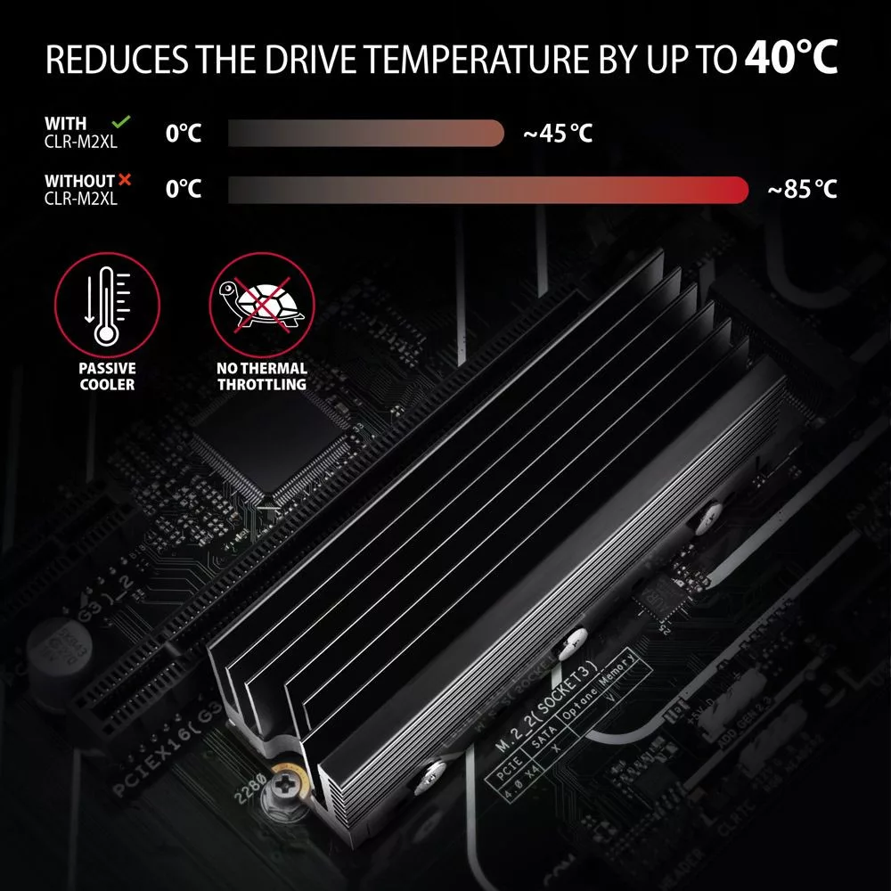 A bordázott 32 mm-es alumínium XL hűtő elősegíti az M.2 SSD lemez működése közben kialakuló hő jobb elvezetését, lehetővé téve ezzel a lemez hőmérsékletének akár 40 °C-kal való csökkentését. Ez meghosszabbítja az M.2 SSD élettartamát, és megakadályozza a lemez lelassulását, az úgynevezett "Thermal Throttling".
