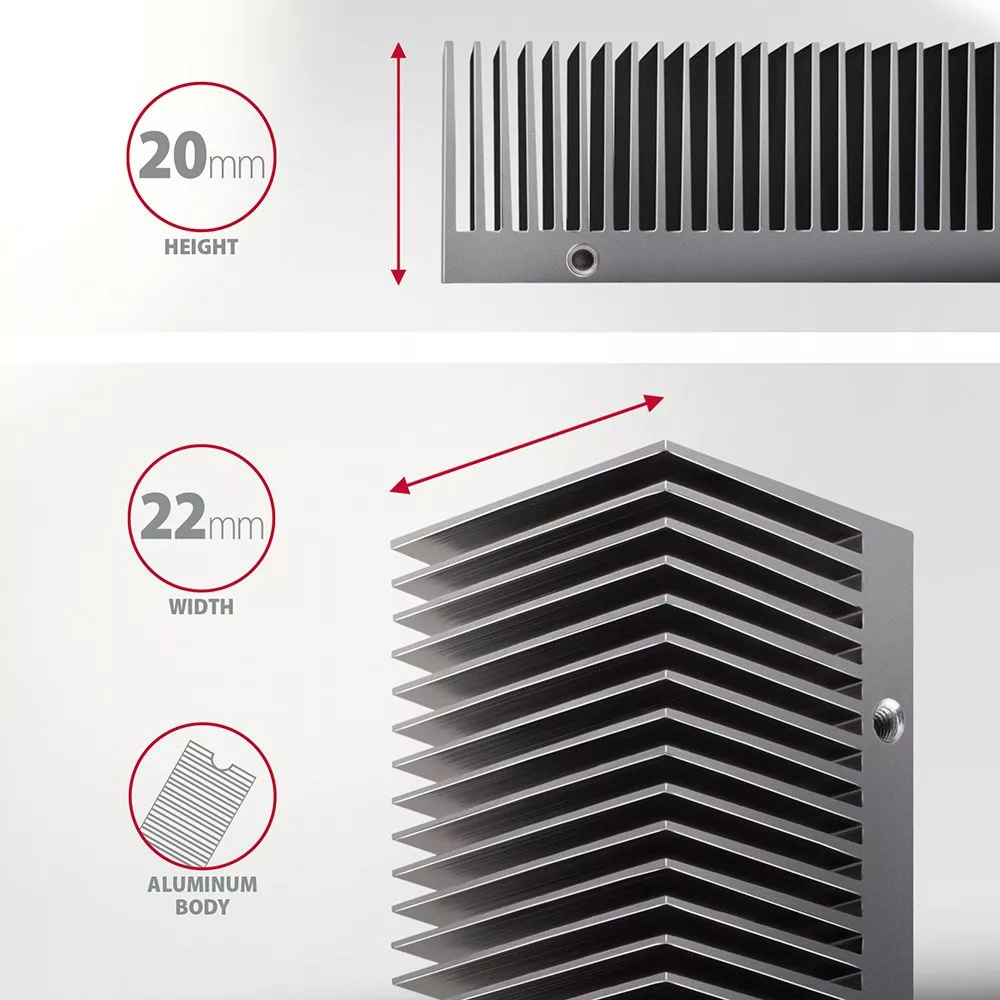 A 24 mm-es teljes magasságának és a 20 mm-es passziv köszönhetően a hűtőborda abban a nyílásban is használható, amely felett a grafikus kártya kinyúlik. Kereszt szalagozás az alumínium passzív bordák és a fémkeret optimalizálják az M.2 SSD meghajtó hőelvezetését, ami akár 30 °C-kal is csökkentheti a meghajtó hőmérsékletét. Ez meghosszabbítja az SSD lemez élettartamát és megakadályozza a lemez sebességének lelassulását, az ún “Thermal Throttling”.