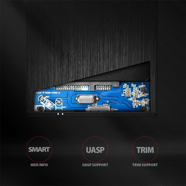 Az aktuális SATA III/6G interfész UASP támogatással lehetővé teszi a modern SSD lemezek sebességének kihasználását.