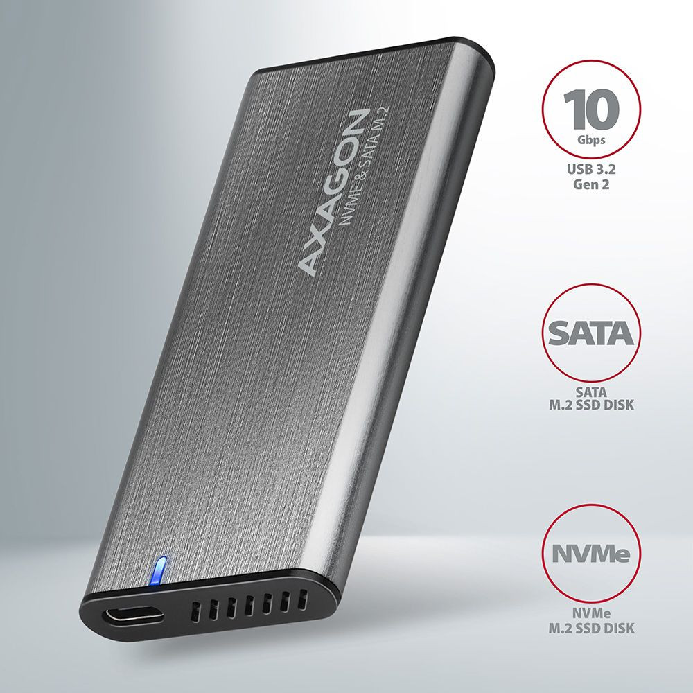 Az univerzális külső AXAGON EEM2-SG2 RAW doboz USB 3.2 Gen 2 interfésszel M.2 NVMe vagy SATA SSD lemezekhez készült. A dobozon található kétoldalas USB-C csatlakozó együtt megbízható csatlakozást tesz lehetővé a számítógéphez. A csomag nem csak egy USB-C -> USB-A kábelt tartalmaz a doboz számítógéphez való csatlakoztatásához, hanem egy USB-A -> USB-C adaptert is. A dobozt a notebook bármelyik szabad USB-portjához csatlakoztathatja.