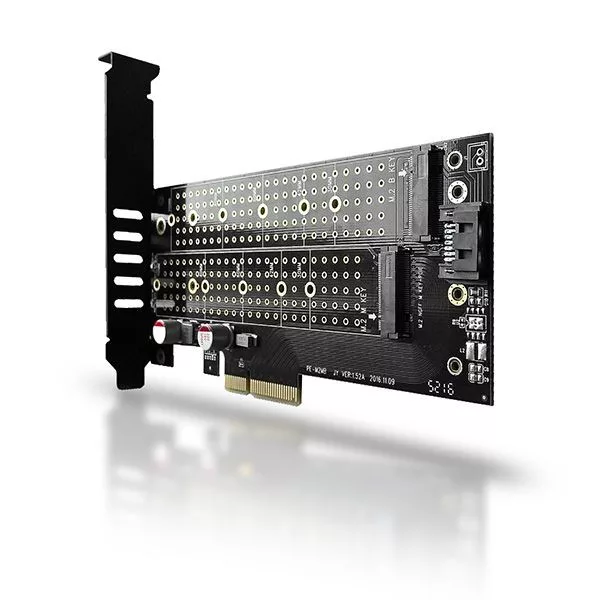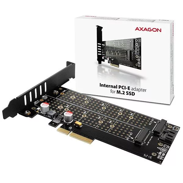 A belső AXAGON PCEM2-D adapter lehetővé teszi akár két M.2 SSD lemez számítógéphez csatlakoztatását PCI-Express gyűjtősín segítéségével. Ideális választás M.2 slottal nem rendelkező asztali számítógépek upgradejéhez.