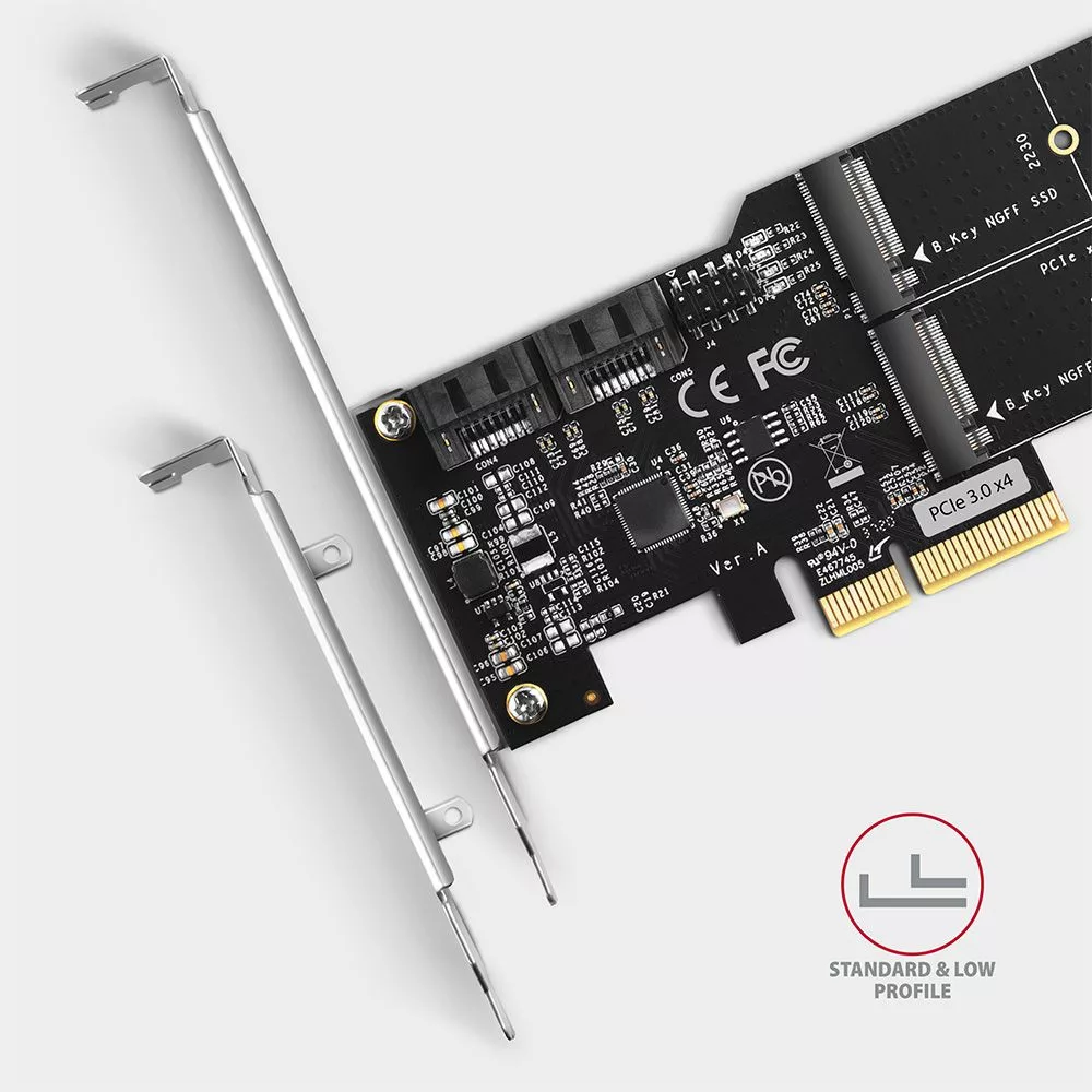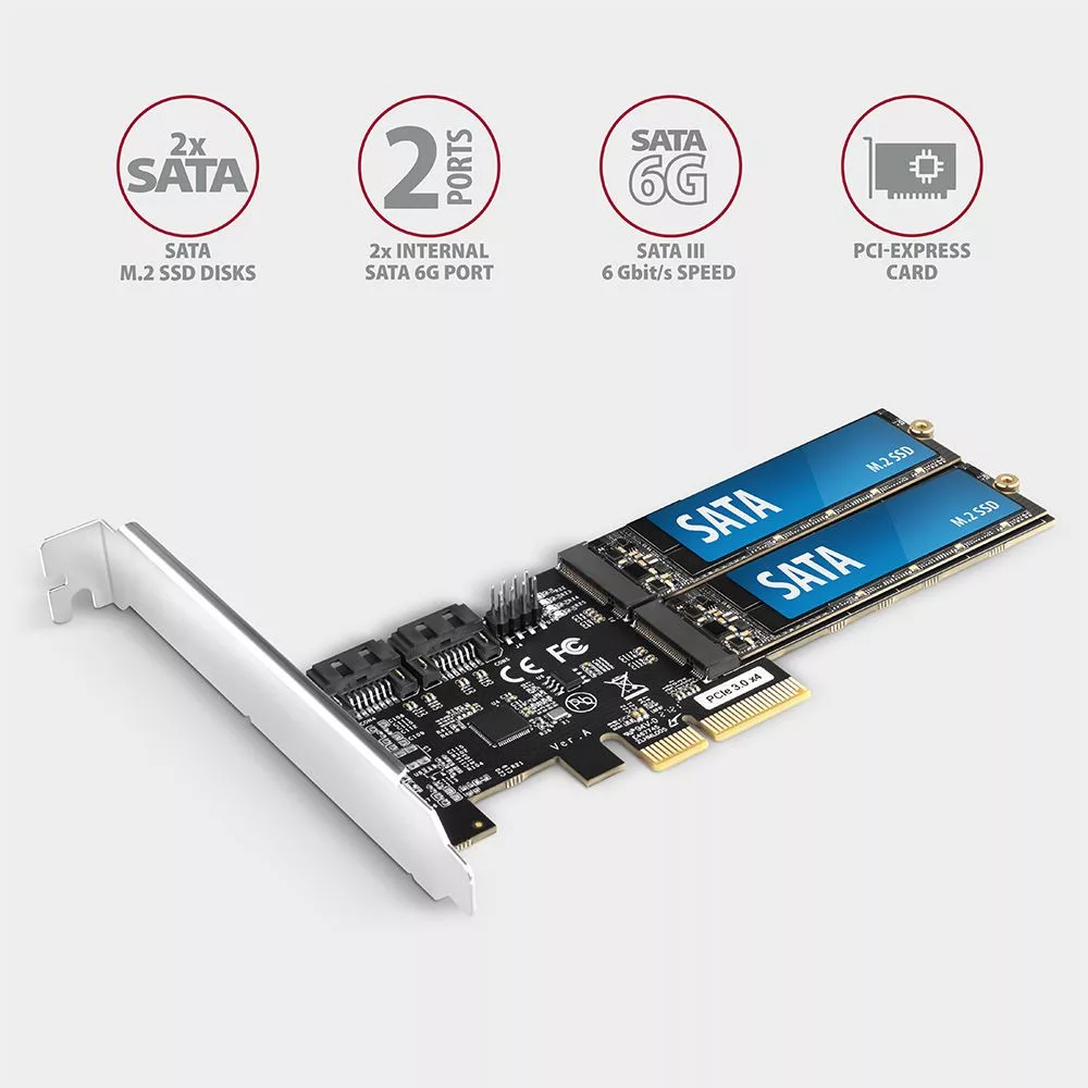 Az AXAGON PCES-SA4M2 PCI-Express kontroller két SATA III porttal és két SATA M.2 lemezhellyel bővíti ki asztali számítógépét akár 6 Gb/s átviteli sebességgel. A két portos SATA III vezérlő és két SATA M.2 foglalat kombinációja nagyon hasznos eszközzé teszi a kártyát a számítógép bővítéséhez. Könnyedén csatlakoztathat akár négy merevlemezt, például két 3.5"-os merevlemezt vagy optikai meghajtót és két SATA M.2 merevlemezt.