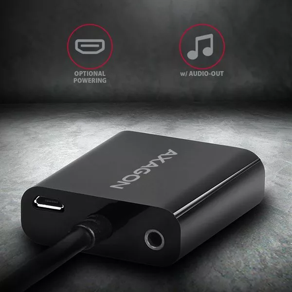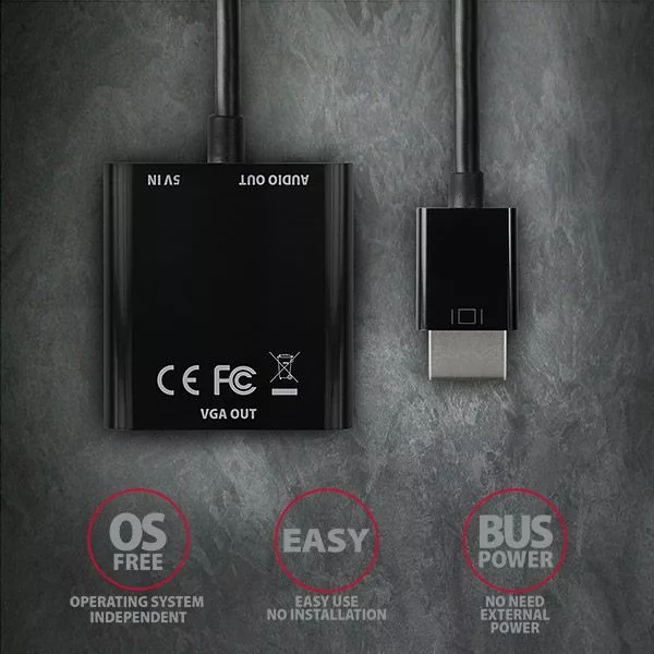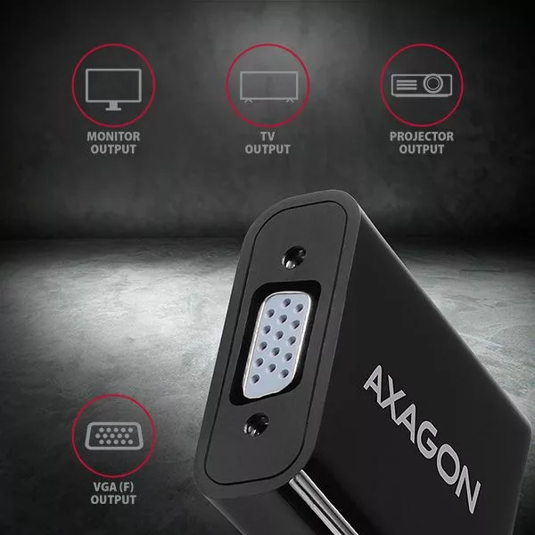 HDMI -> VGA aktív AXAGON RVH-VGAN adapter hangkimenettel a régebbi VGA monitor / TV / projektor számítógéphez vagy egyéb HDMI kimenethez való csatlakoztatáshoz. Használható set-top boxokkal vagy Xbox és Playstation konzolokkal is.