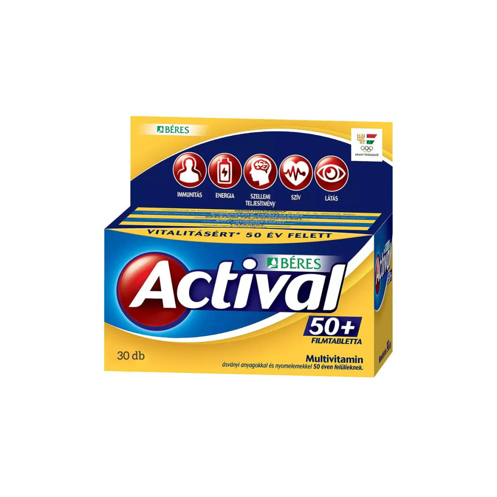 Actival 50+ filmtabletta 30dbAz Actival 50+ hatóanyagai hozzájárulnak 50 év felett a szervezet vitamin-, ásványi anyag- és nyomelemszükségletének biztosításához, ezáltal a teljesítőképesség fenntartásához, az immunrendszer normális működéséhez. Szervezetünknek szüksége van a létfontosságú vitaminok, ásványi anyagok és nyomelemek bizonyos mennyiségű napi bevitelére. Az Actival multivitamin készítményeket a Béres tudományos szakértői csoportja a legújabb, nemzetköziajánlások figyelembevételével fejlesztette ki. Az Actival 50+ filmtabletta komplex étrend-kiegészítő multivitamin ásványi anyagokkal és nyomelemekkel 50 éven felülieknek. A hazai 50 éven felüli lakosság szükségleteihez igazított összetétel. A felmérés szerint az idősebb korosztály több vitaminból (D-, B5 -vitamin, biotin, folsav) nem fogyaszt elegendő mennyiséget.Felnőtteknek 50 év felett napi 1 filmtabletta étkezés után, minimum egy deciliter folyadékkal."A javasolt napi adagnál nem szabad többet beszedni!Gyermekek elől gondosan elzárandó!Kumarin típusú véralvadásgátlót szedő betegek a készítmény szedése előtt kérjék ki orvosuk véleményét.A termék száraz helyen, fénytől védve, eredeti csomagolásban legfeljebb 25 °C-on tárolandó."Összetevők: kalcium-karbonát, tömegnövelő szerek (mikrokristályos cellulóz, mannit, polivinilpolipirrolidon),kalcium ortofoszforsavval alkotott sója, magnézium-oxid, Laszkorbinsav, stabilizátorok [poli(vinil-pirrolidon)-vinilacetát kopolimer, polivinil-alkohol, gumiarábikum], cinkszulfát, maltodextrin, vas(II)-glükonát, nikotinamid, Panax ginseng gyökér natív kivonat, csomósodást gátló anyagok (talkum, zsírsavak magnéziumsói, kalcium-szilikát, szilícium-dioxid), hordozó (polietilénglikol), DL-alfatokoferil-acetát, kalcium-D-pantotenát, zselatin, réz(II)-glükonát, piridoxin-hidroklorid, szacharóz, riboflavin, kukoricakeményítő, tiamin-mononitrát, színezékek (vasoxidokés vas-hidroxidok), retinil-acetát, emulgeálószer (polioxietilén-szorbitan-monooleát), pteroilmonoglutaminsav, részben hidrogénezett szójababolaj (teljes mértékben finomított), kálium-jodát, ammóniummolibdát, króm(III)-klorid, savanyúságot szabályozó anyagok (trinátrium-citrát, citromsav), antioxidáns (butilhidroxi-toluol, alfa-tokoferol), nátrium-szelenit, D-biotin, fitomenadion, kolekalciferol, cianokobalaminEgyéb allergén információ: Kumarin típusú véralvadásgátlót szedő betegek a készítmény szedése előtt kérjék ki orvosuk véleményét.Tápértékadatok100 g100 gEnergia (KJ/Kcal)307 kJ/74 kcalZsír0,7 gebből telített zsírsavak0,6 gSzénhidrát5,6 gebből cukor0,6 gRost0 gFehérje16 gSó0 g