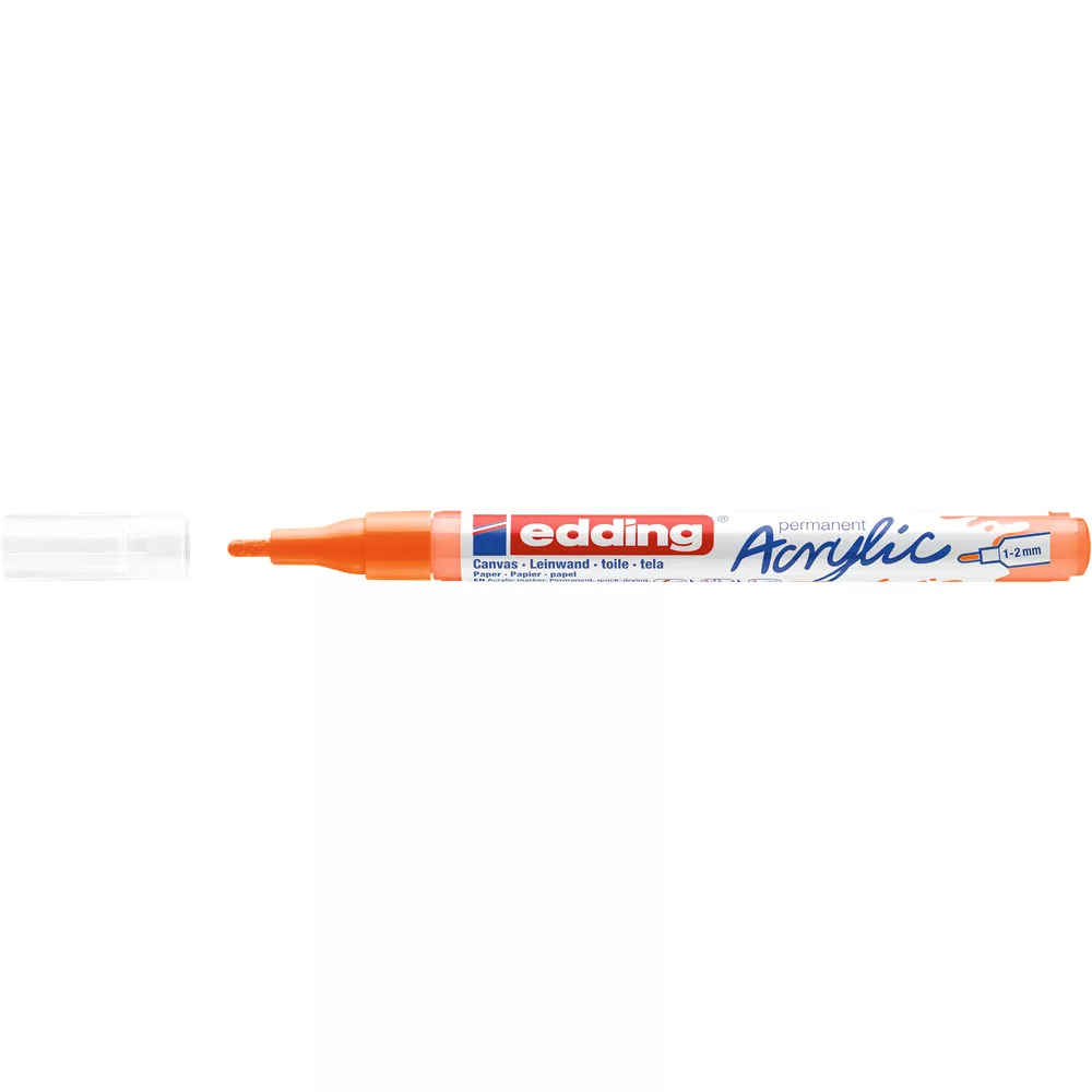 Akril marker világos vagy sötét felületekre történő festéshez, ideális olyan anyagokhoz, mint a vászon vagy a festőpapír. - A kerekített csúcs vonalvastagsága 1-2 mm. - A kiváló minőségű, pigmentált, vízbázisú akrilfesték száradás után rendkívül tartós, átlátszatlan, fényálló és szagtalan. - A neon narancssárga szín áttetsző. Megfelelő pótcsúcsok (edding 5300 pótcsúcsok) elérhetők.- 20 féle színválasztékban elérhetők- Keresse a további változatokat - edding 5000 és az edding 5100-at, valamint az edding 5400 3D hatású 2 végű akril markereket. Katalóguskód: 36445