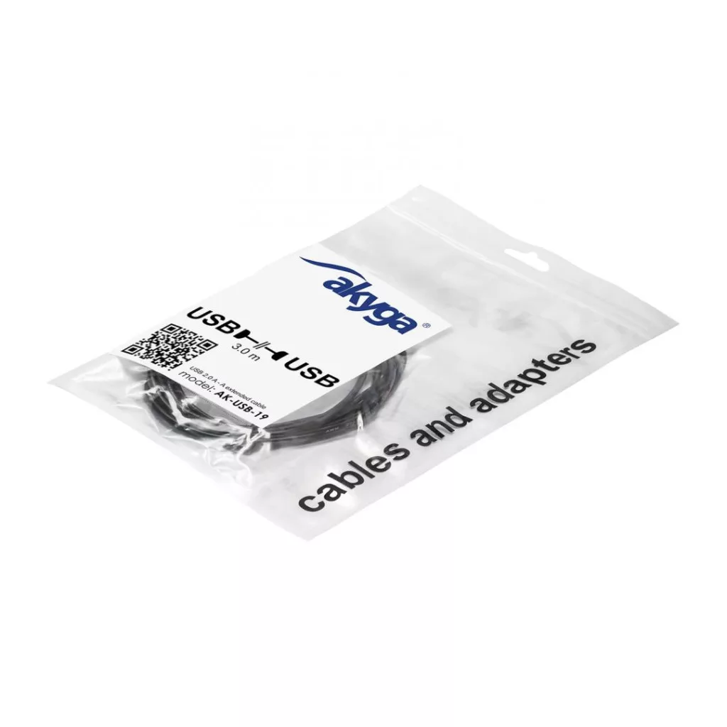 Az Akyga® AK-USB-11 egy 1,8 m hosszú kábel, amely lehetővé teszi az adatátvitelt USB 2.0 szabványban és az áramellátást a csatlakoztatott eszköz típusától függően. Két USB A csatlakozóval rendelkezik, amelyeket USB A csatlakozóval felszerelt eszközök csatlakoztatására vagy USB hosszabbító kábelként használnak.