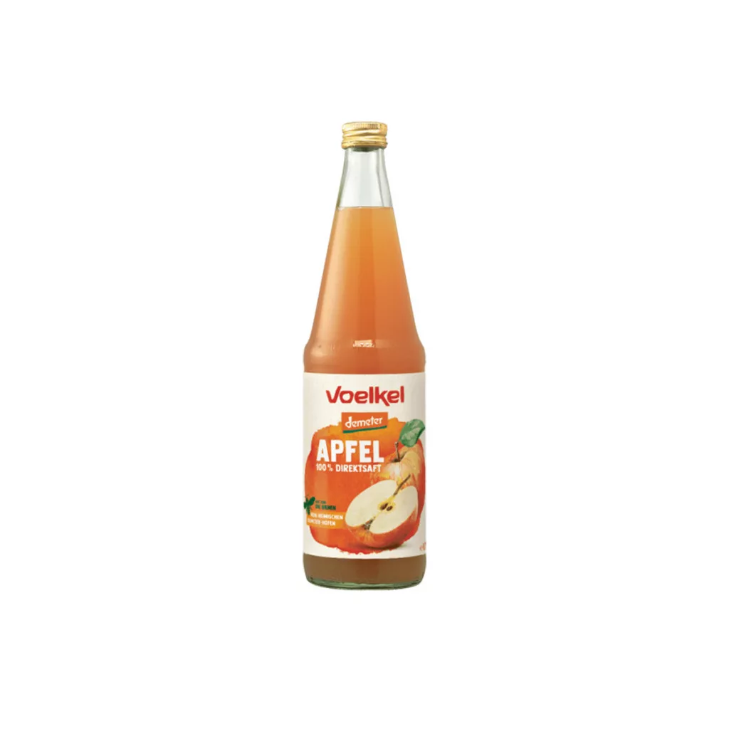 A Voelkel Demeter Almalé tiszta, 100% bio alma levéből készült, mely Demeter minősítéssel rendelkezik. Természetes édessége és frissítő íze mellett tápanyagokban gazdag, hozzáadott cukor és tartósítószerek nélkül. Kiváló választás a mindennapi hidratáláshoz és egészségmegőrzéshez.Összetevők: Almalé** **biodinamikus termelésből származó almaléÁtlagos tápérték 100g termékben:Energia: 197kj/47kcalZsír: <0,5g Amelyből telített zsírsavak: <0,1g Szénhidrát: 11g Amelyből cukrok: 10g Fehérje: 0,5g Rost: 0g Só: 0,01g