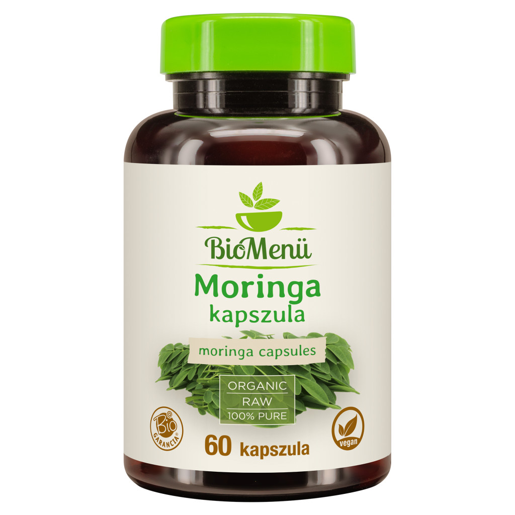 Összetevők: 100% bio moringa (moringa oleifera) levélpor; térfogatnövelő szer: mikrokristályos cellulóz; csomósodást gátló anyag: zsírsavak mono- és digliceridjei, szilícium-dioxid; kapszulahéj: hidroxipropil-metil-cellulóz