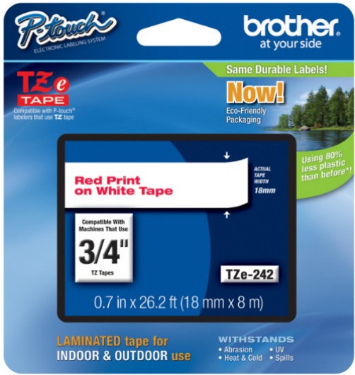 **TZe -242 öntapadós laminált címkeszalag tartós feliratok nyomtatásához.** * Szalag típusa: Standard laminált * Szalag szélessége: 18 mm * Szalag hossza: 8 m * Szalag színe: Fehér * Felirat színe: Piros