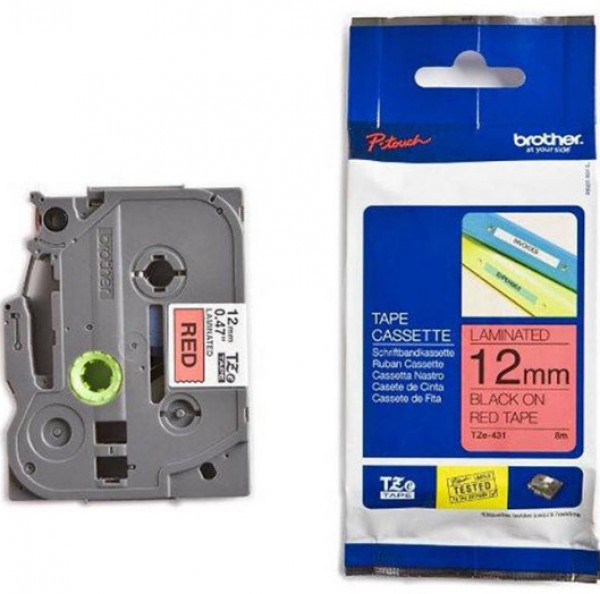 **TZe -431 öntapadós laminált címkeszalag tartós feliratok nyomtatásához.** * Szalag típusa: Standard laminált * Szalag szélessége: 12 mm * Szalag hossza: 8 m * Szalag színe: Piros * Felirat színe: Fekete