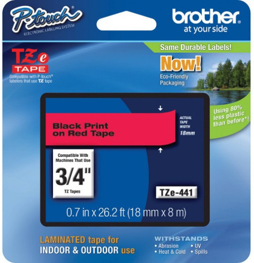 **TZe -441 öntapadós laminált címkeszalag tartós feliratok nyomtatásához.** * Szalag típusa: Standard laminált * Szalag szélessége: 18 mm * Szalag hossza: 8 m * Szalag színe: Piros * Felirat színe: Fekete