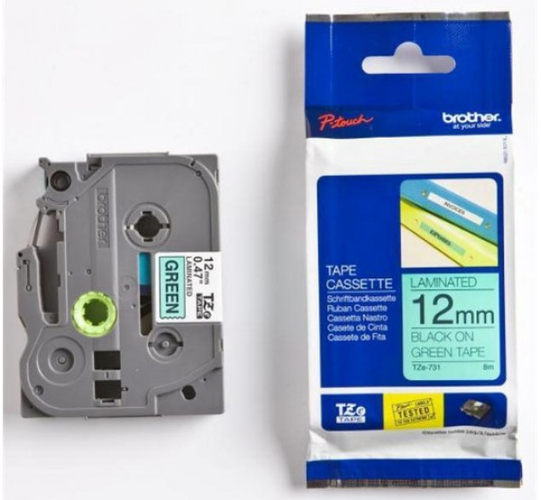 **TZe -731 öntapadós laminált címkeszalag tartós feliratok nyomtatásához.** * Szalag típusa: Standard laminált * Szalag szélessége: 12 mm * Szalag hossza: 8 m * Szalag színe: Zöld * Felirat színe: Fekete