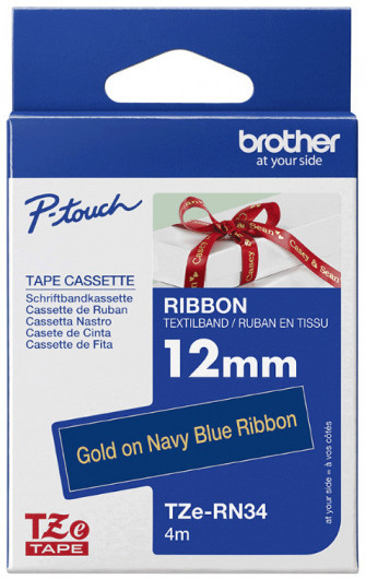 **TZe-RN34 Sötétkék selyem szalag arany színű feliratokhoz** * Szalag típusa: Selyem * Szalag szélessége: 12 mm * Szalag hossza: 4 m * Szalag színe: Sötétkék *Felirat színe: Arany