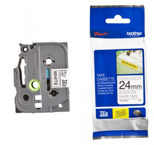 **TZe -S251 ERŐS tapadású laminált címkeszalag tartós feliratok nyomtatásához.** * Szalag típusa: Erős tapadású laminált * Szalag szélessége: 24 mm * Szalag hossza: 8 m * Szalag színe: Fehér * Felirat színe: Fekete