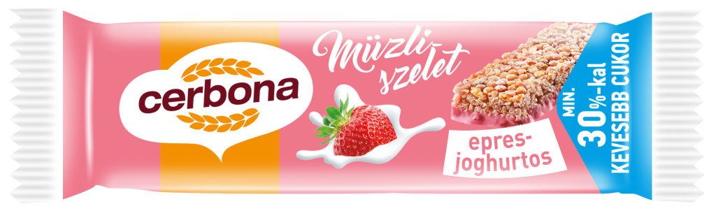 Epres müzliszelet epres-joghurtos bevonattal. Legújabb müzliszeletünk, mely kevesebb cukorral készült!