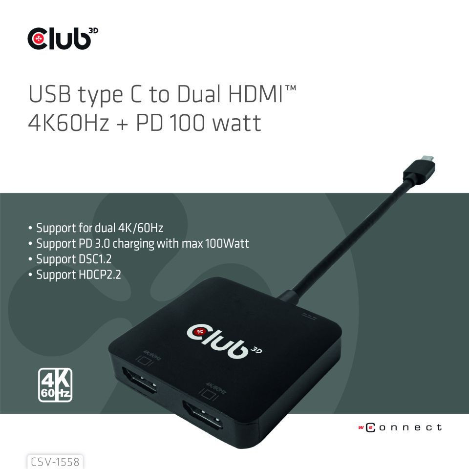 Club3D Club3D MST-Hub USB 3.2 Typ C > 2x HDMI 4K60Hz +100W PD St/Bu retail
