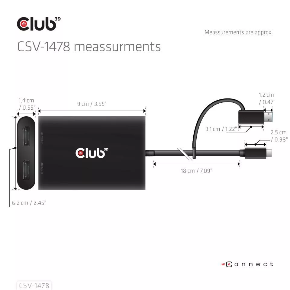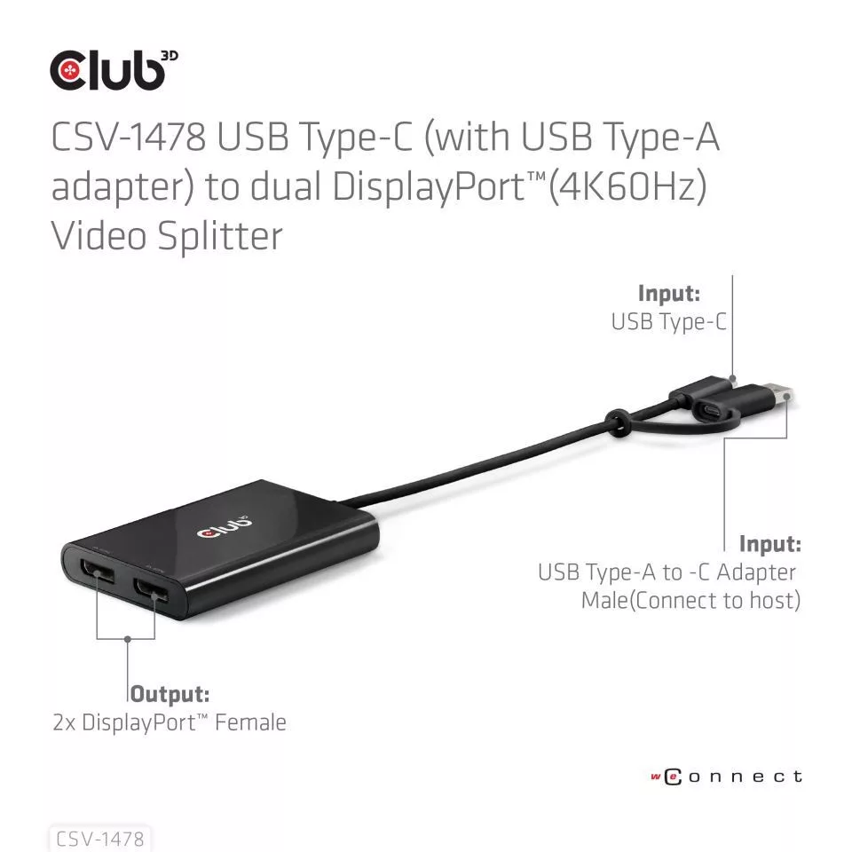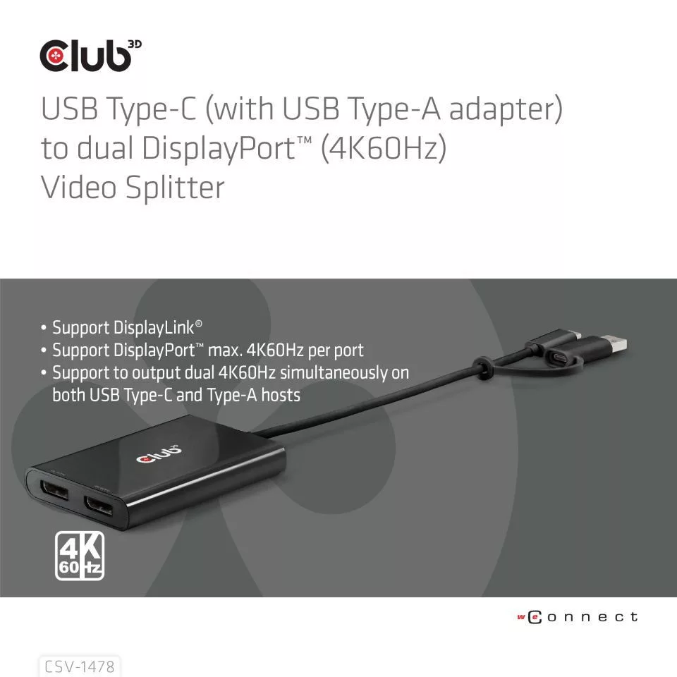 Club3D USB Type-C (with USB Type-A adapter) to dual DisplayPort (4K60Hz) Video Splitter