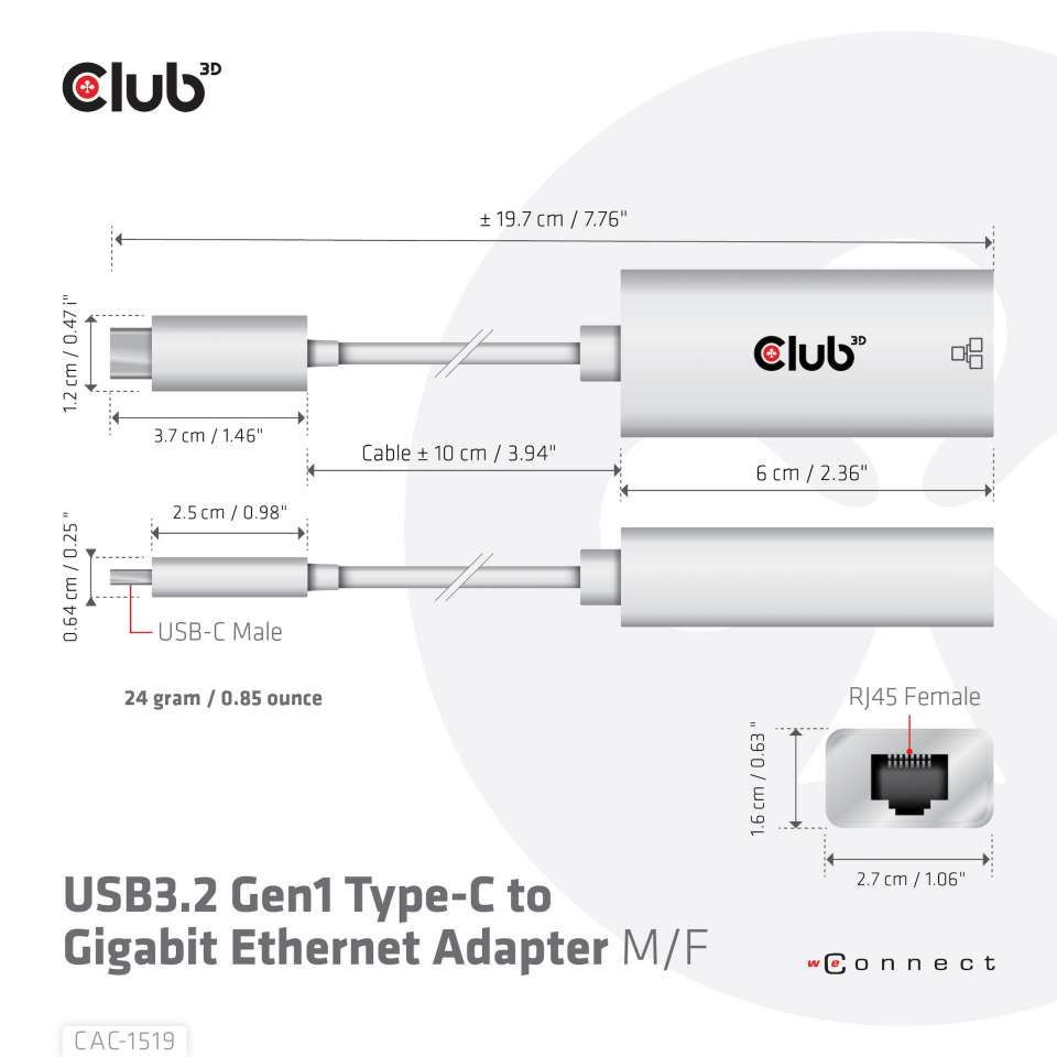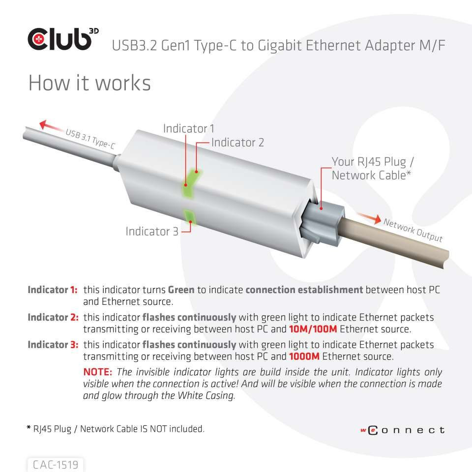 A Club 3D CAC-1519 egy USB3.2 GEN1 Type-C Gigabit Ethernet adapter. Lehetővé teszi, hogy az új MacBook Pro, ChromeBook vagy más USB-C támogatott host PC a Gigabit Ethernet port csatlakoztatásával hozzáférjen egy gyors Ethernet hálózathoz. Az Ethernet-adapter kompakt és rendkívül hordozható. Az USB C portról táplált adapter nem igényel külső tápellátást, így ideális notebookokhoz és ultrabookokhoz.