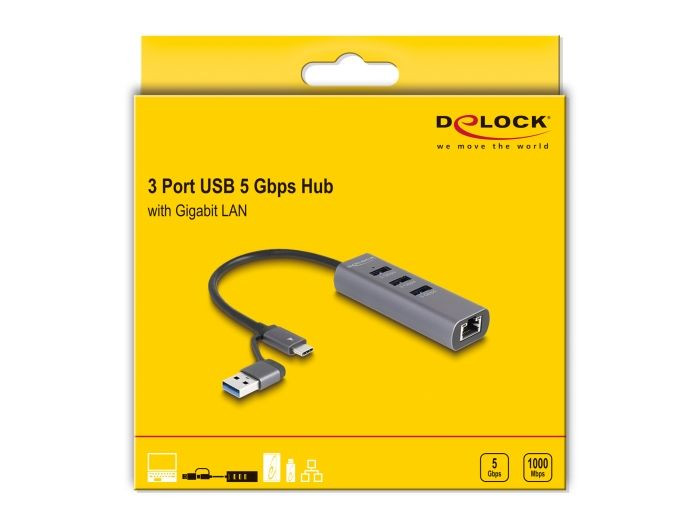 Ez a Delock biztos USB hub fém kerettel összeköthető egy számítógéppel, laptoppal vagy mobil eszközzel A-típusú USB vagy USB-C™ csatlakoztató felületen keresztül. Akár három USB eszköz csatlakoztatható az elosztóhoz.