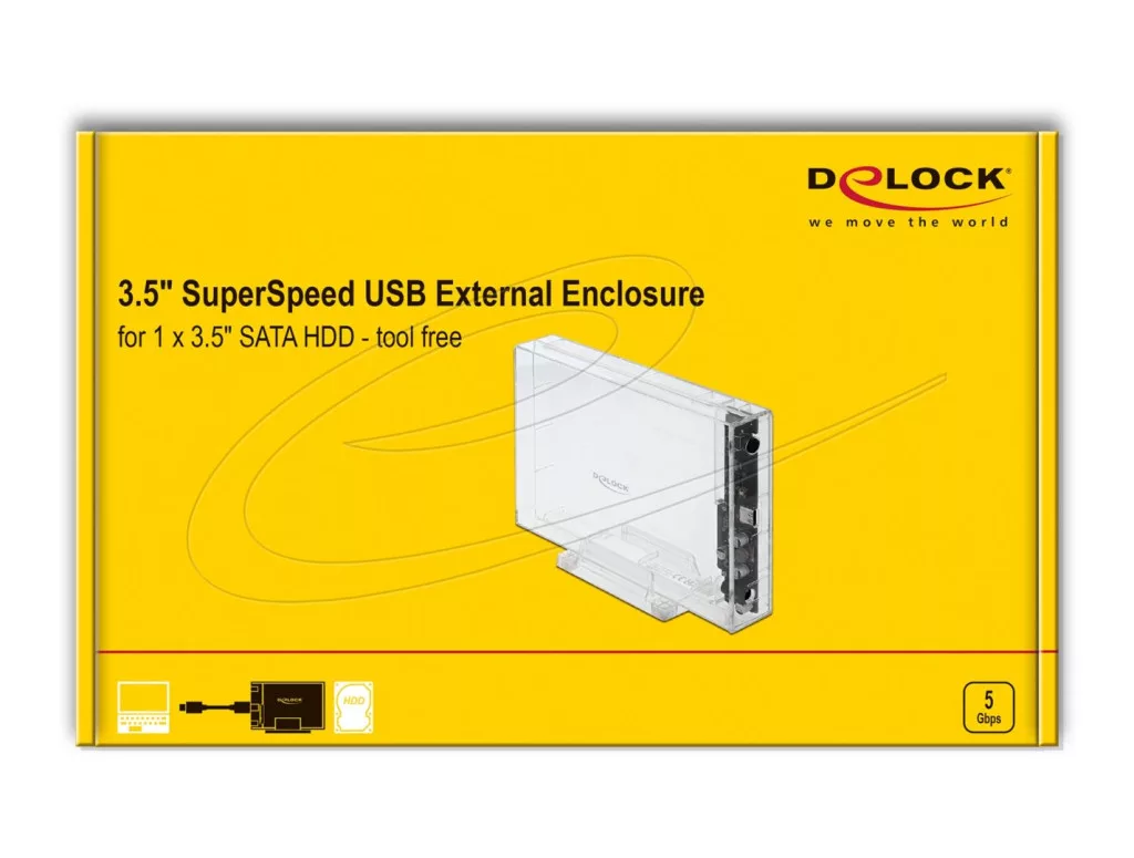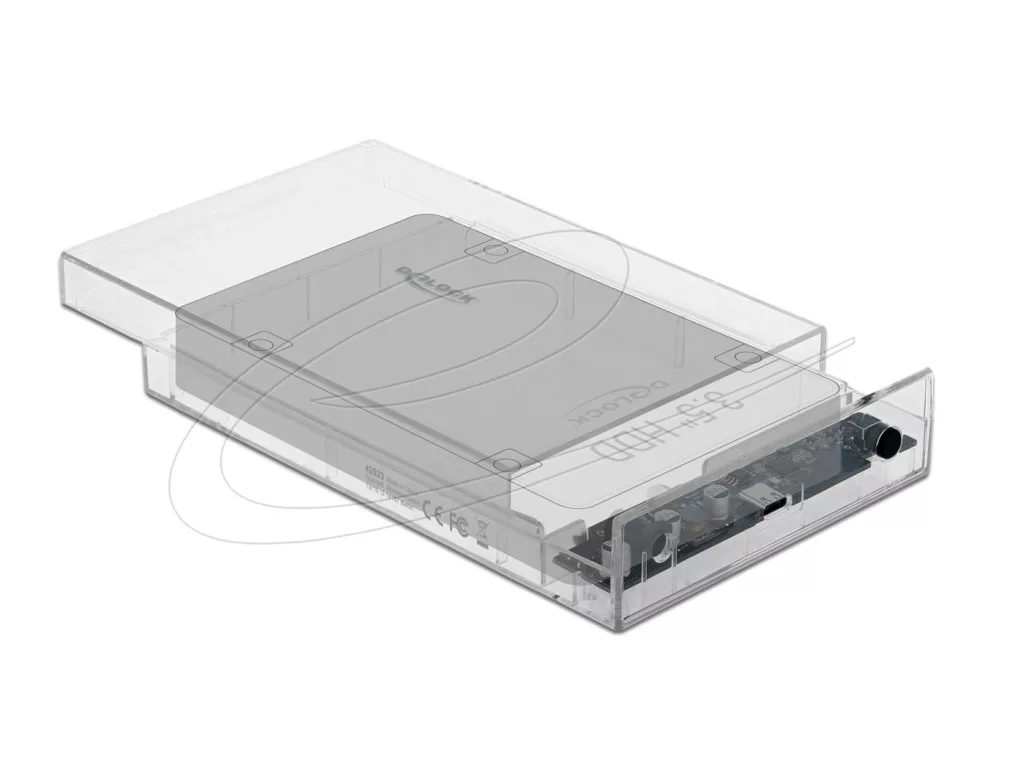 Ez a Delock műanyag ház használható 3.5″ SATA merevlemez beépítésére. A mellékelt USB kábelek biztosítják a kapcsolatot egy szabad A vagy