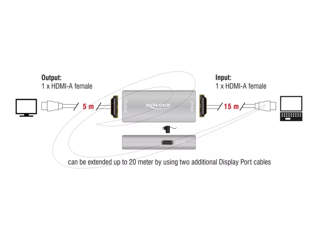 HDMI-ismétlő a HDMI-csatlakozás jelének erősítésére használható 20 méterig. Egy maximum 15 méter hosszú kábel csatlakoztatható egy asztali vagy hordozható számítógép és az ismétlő bemeneti portja között, a másik oldalon pedig egy maximum 5 méter hosszú kábel az ismétlő kimeneti portjába, amely ezután egy kijelzőhöz vagy televízióhoz csatlakoztatható. Az ismétlő legfeljebb az 8K Ultra HD (8K @ 60 Hz) felbontást támogatja, és visszamenőleg kompatibilis a Full-HD 1080p szabvánnyal.