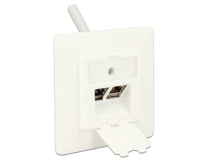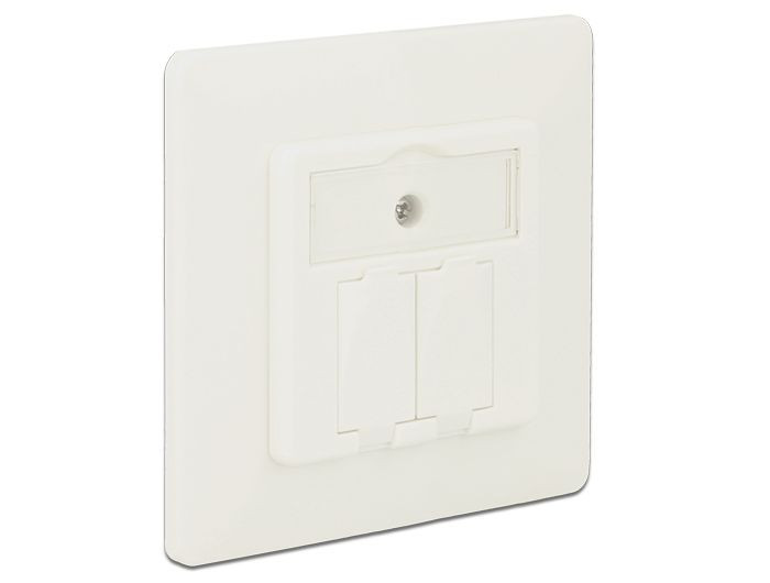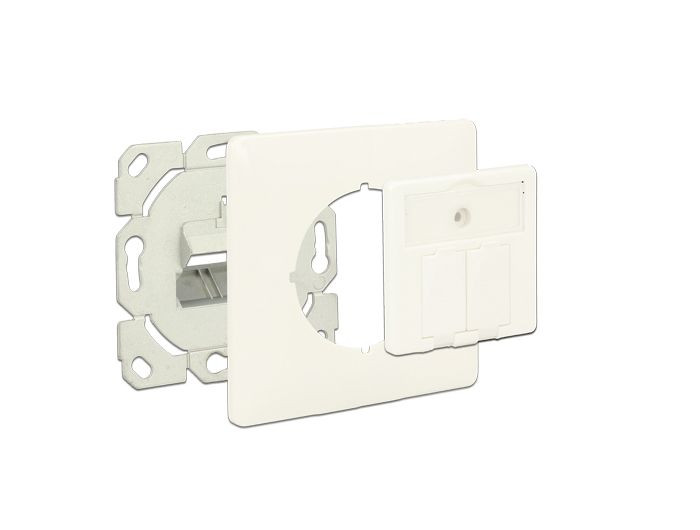 Ez a Delock fali konnektor a falba vagy 60 mm-es rögzítőfuratokkal ellátott hátlapi dobozra szerelhető. Szabványosított méreteivel alkalmas két Keystone modul egyszerű bepattintható beépítésére.