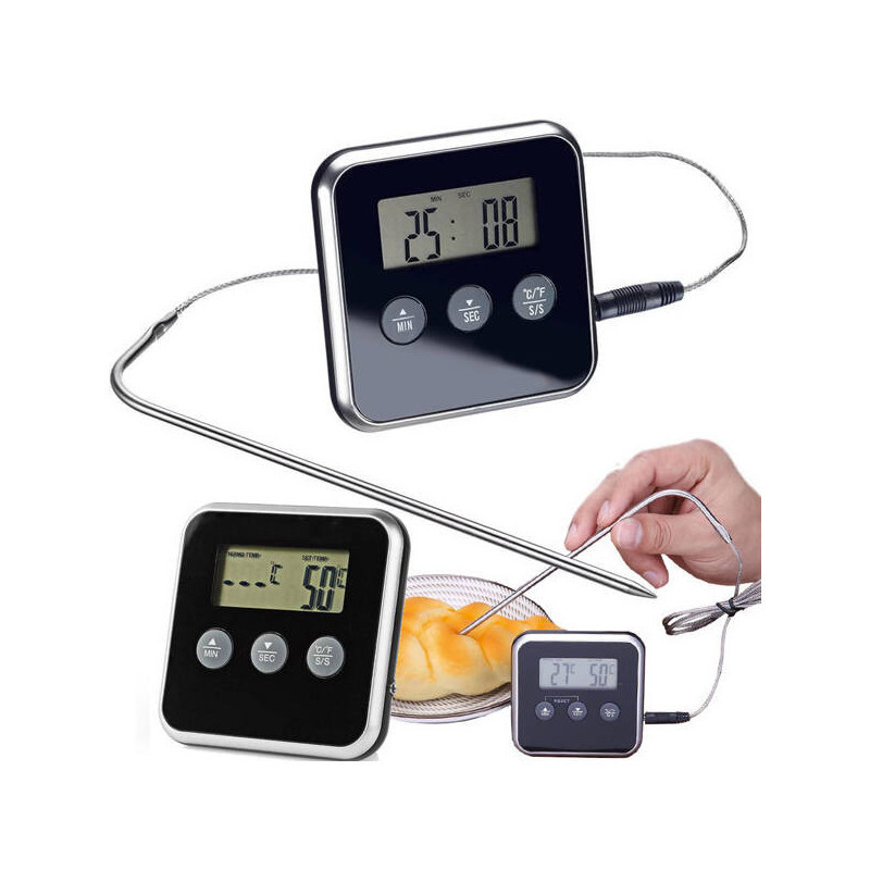 Ez az elektronikus LCD hőmérő tökéletesen alkalmas húsok, folyadékok, sütemények, grillezett ételek stb. hőmérsékletének mérésére. Lehetővé teszi bármely termék hőmérsékletének kényelmes ellenőrzését. Ideális a konyhában főzés közben az étel hőmérsékletének ellenőrzésére. Az LCD kijelző, amely könnyen olvasható, pontosan megjeleníti a hőmérsékletet Celsius vagy Fahrenheit fokban. Intuitív vezérlőpanel található a hőmérő házán. Akár 99 perc és 59 másodpercig tartó időzítővel rendelkezik. Hangjelzés jelzi, amikor elértük a beállított hőmérsékletet. Akár három felszerelési lehetőséggel is rendelkezik: függőlegesen, neodímium mágnessel és talppal.Tulajdonságok: Készült magas minőségű anyagokból Rozsdamentes acélból készült sonda Könnyen olvasható LCD kijelző Méri a hőmérsékletet Celsius vagy Fahrenheit fokban Mérési tartomány: -50° C-tól +250° C-ig (-13° F-től 82° F-ig) Pontosság: 1° C Időzítő Talp Mágnes Hangjelzés a beállított hőmérséklet elérésénél Tápellátás: 1 x AAA elem (nem tartalmazza) Kapcsoló a tok hátoldalán: Óra/Időzítő, BE/KI Kábelhossz: kb. 70 cm Szín: fekete A termék CE minősítéssel rendelkezikMiért vedd meg ezt?