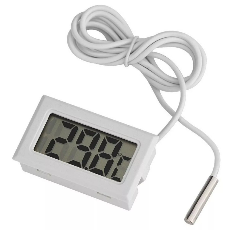 Elektronikus hőmérő nagy LCD kijelzővel és hosszú kábelre csatlakozó érzékelővel. Az érzékelőt (szenzort) alapvetően bárhová el lehet helyezni, például akváriumba, terráriumba, hűtőszekrénybe, fagyasztóba, üvegházba stb. Mindenhová, ahol pontos hőmérsékletmérésekre van szükségünk -50 és 70 Celsius fok közötti tartományban!