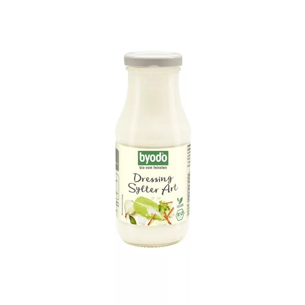 Krémes állag, friss hagymás íz – a Byodo „Sylter Art” öntet méltó alternatívája a klasszikus joghurtos szósznak. Ráadásul vegán és laktózmentes, így még többek számára elérhető az élmény! Tippünk: Kóstold meg a Byodo bio „Sylter Art” öntetet ropogós jégsalátával vagy reszelt répával, finomra kockázott naranccsal – garantáltan a dresszingek mennyországában érzed majd magad!Összetevők: Víz, napraforgóolaj*, hagyma (11 %), brandy ecet, agávészirup*, kősó, napraforgófehérje*, sűrítőanyag: guargumi*, kukoricakeményítő*, sárgarépa*, fűszerek*, zöldfűszerek* *ellenőrzött ökológiai gazdálkodásbólÁtlagos tápérték 100g termékben:Energia: 1127kJ//273 kcalZsír: 28g Amelyből telített zsírsavak: 3,1g Szénhidrát: 5,1g Amelyből cukrok: 4,7g Fehérje: 0,6g Rost: Só: 1,2g