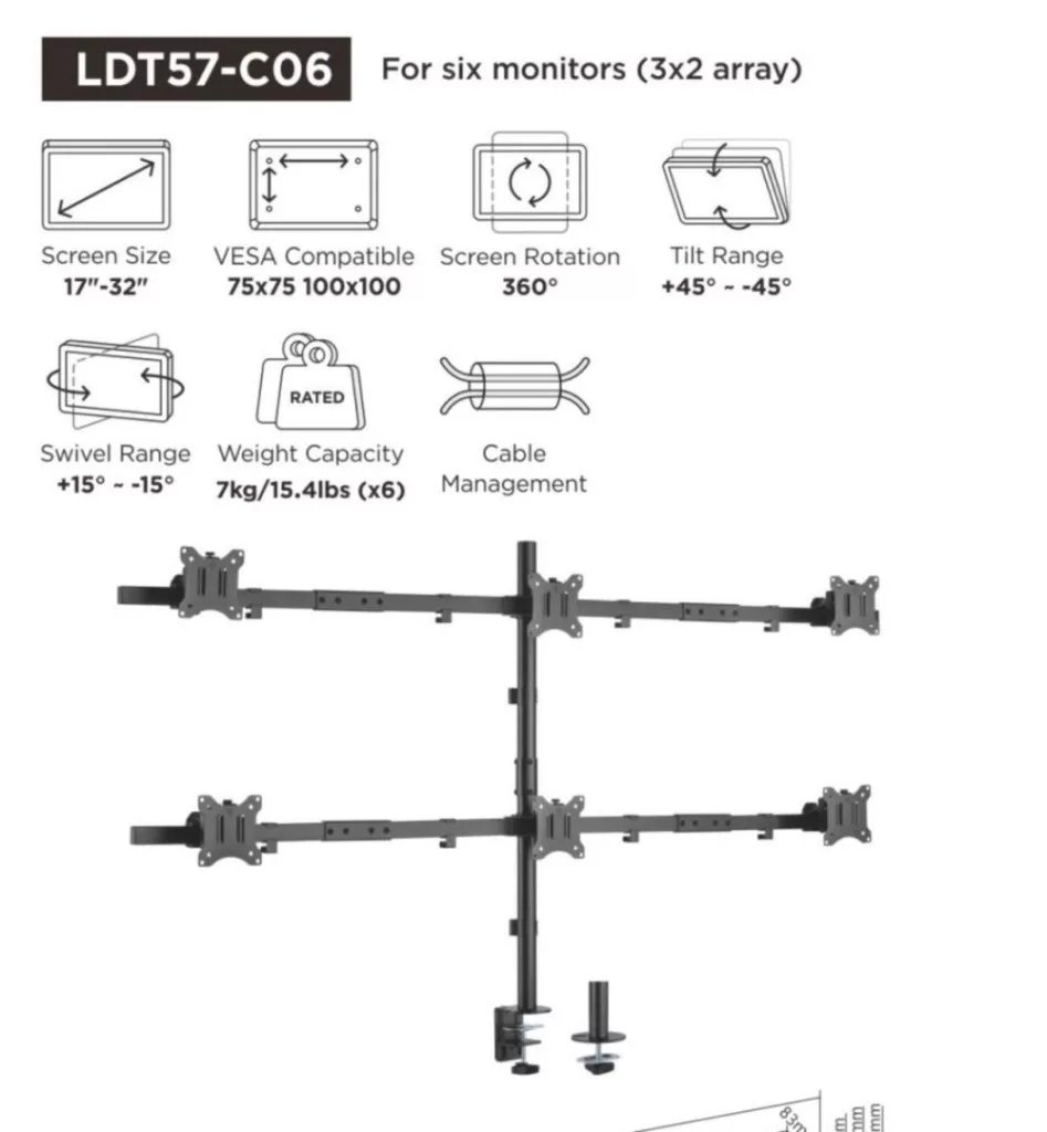 Az Equip 650160 17"-32" csuklós 6 monitoros asztali konzol sokoldalú és hatékony megoldás a munkaterület optimalizálásához. Ezt a konzolt úgy tervezték, hogy hat, 17"-tól 32"-ig terjedő képernyőméretű monitor befogadására alkalmas, rugalmas és kiterjedt kijelzőfelállítást kínálva.
