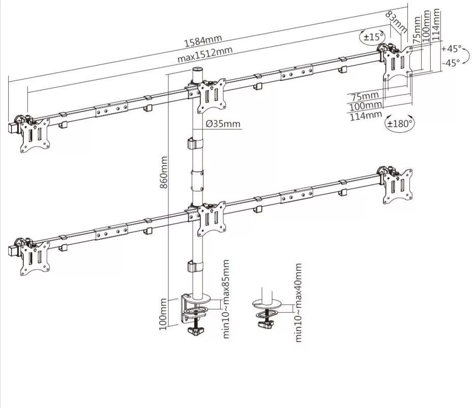 Csuklós karjaival ez a tartó lehetővé teszi, hogy minden egyes monitor pozícióját és szögét külön-külön állítsa be. Ez a funkció fokozza az ergonómiai kényelmet, és segít csökkenteni a szem megerőltetését, mivel lehetővé teszi, hogy a megtekintési szögeket az Ön preferenciáinak és igényeinek megfelelően testre szabja.