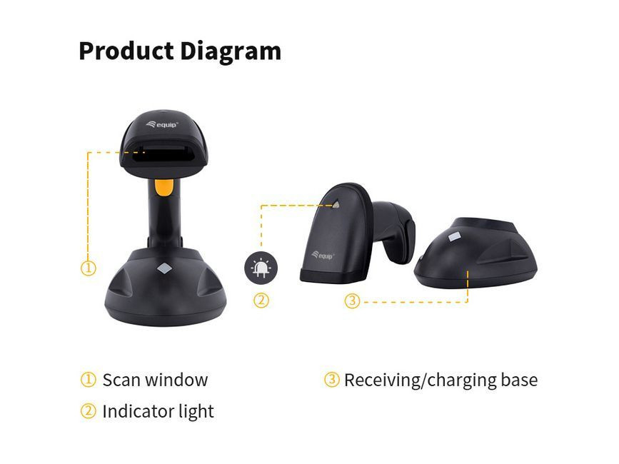 Többféle beolvasási mód: Lehetőségek a kézi, folyamatos , automatikus indukciós módú beolvasáshoz.Plug-and-play funkcionalitás a gyors beállításhozPárosítási képesség bázisállomás támogatja akár 20 szkenner csatlakozását iscsak angol ékezetek nélküli karaktereket kezeli (magyar karakter készletet nem)Több mint 2,000 beolvasott adat memóriamegőrzése (@ vonalkód hossza < 15 bájt).Tápforrás USB a PC / Host rendszerről. töltőállomás mellékelve.Beépített akkumulátor 3,7V 1500mAh Li-ion. Munkaidő: kb. 20 óra, készenléti idő: 3 hónap.Az Equip vezeték nélküli 2D vonalkódolvasó nagy távolsági képességgel és állvánnyal sokoldalú és hatékony szkennelési megoldás a különböző iparágak számára. Ez a készülék lehetővé teszi a 2D vonalkódok távolságból történő könnyed rögzítését, így ideális kiskereskedelmi, raktározási és leltárkezelési alkalmazásokhoz. A mellékelt állvánnyal a készülék kéz nélkül is használható, ami növeli a termelékenységet és csökkenti a felhasználó fáradtságát. Ez a szkenner kivételes teljesítményt és csatlakoztatási lehetőségeket kínál, biztosítva a meglévő rendszerekbe való zökkenőmentes integrációt. Vezeték nélküli képességei rugalmasságot biztosítanak, míg a nagy távolságú szkennelési képesség megbízható adatrögzítést biztosít, még távolról is. Akár termékeken, polcokon vagy csomagokon kell vonalkódokat beolvasnia, ez a szkenner leegyszerűsíti a folyamatot, racionalizálja a műveleteket és javítja a pontosságot.