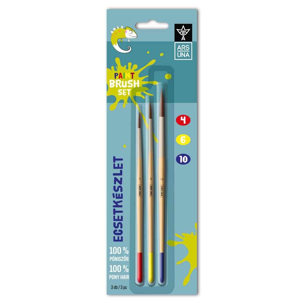 - 3 db-os ecsetkészlet.Kerek, natúr fa ecsetek, a végén festéssel és valódi póniszőrből készült hegyes ecsetfejjel.