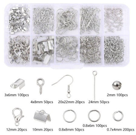 1 db készlet, mely 10 féle szereléket tartalmaz: Zsinór vég Csavaros medáltartó Stopper Akasztós fülbevaló alap Szalagvég Hurkos szerelőpálca Delfinkapocs Szerelőkarika 3 méretben